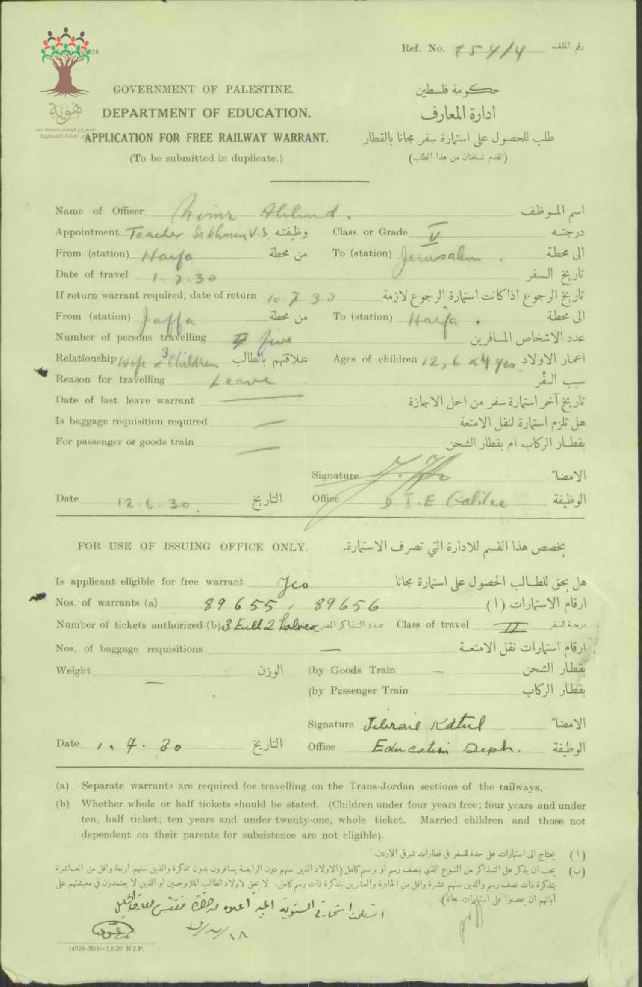 طلب للحصول على استمارة سفر مجاناً بالقطار للمعلم نمر عبود /سخنين