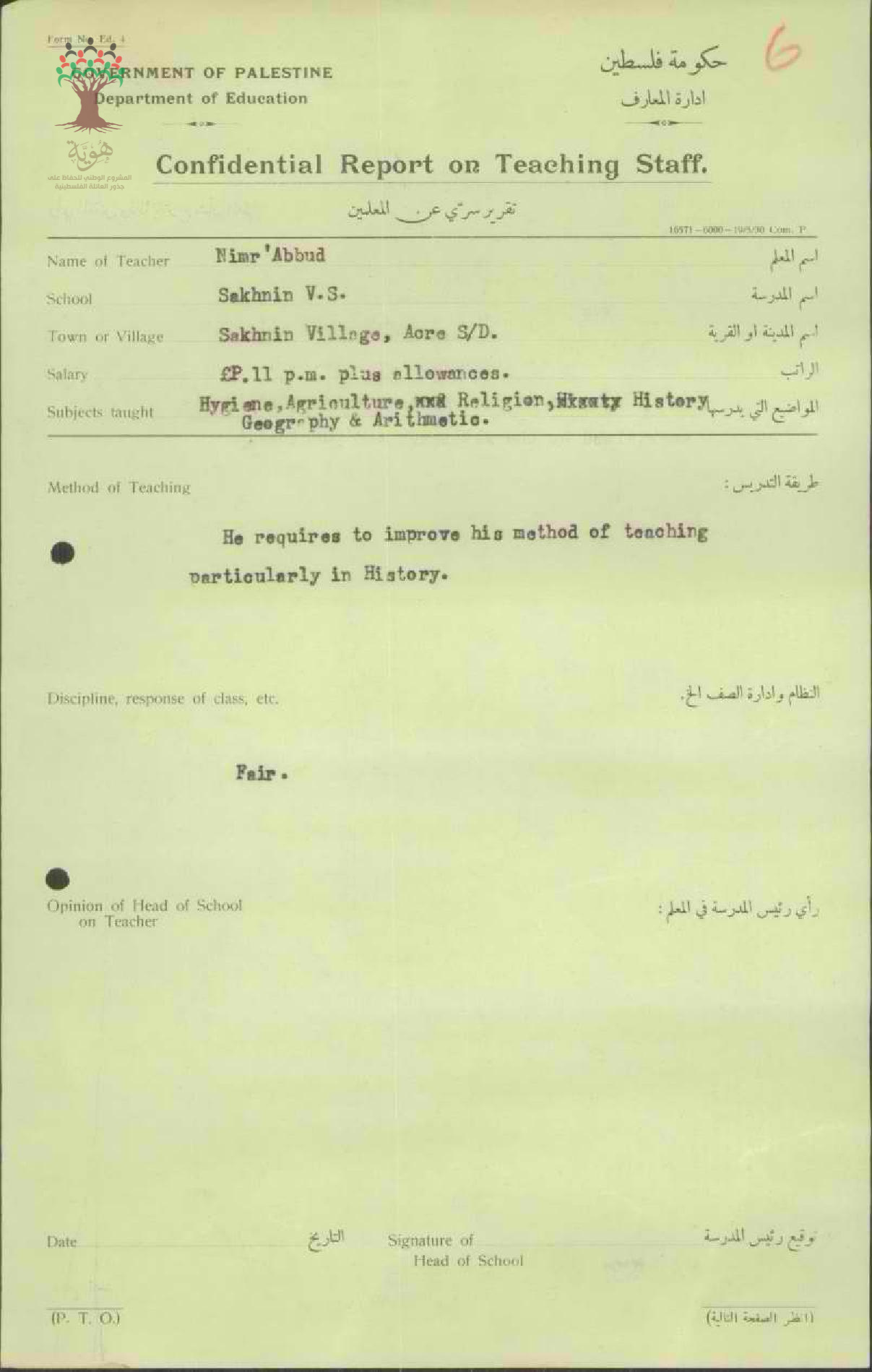 تقرير تفصيلي عن أداء المعلم نمر عبود في مدرسة سخنين سنة 1931