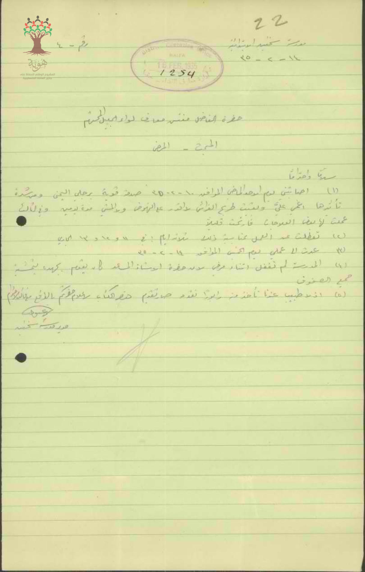 رسالة من المعلم نمر عبود إلى مفتش المعارف يخبره عن اصابته وغيابه عن العمل