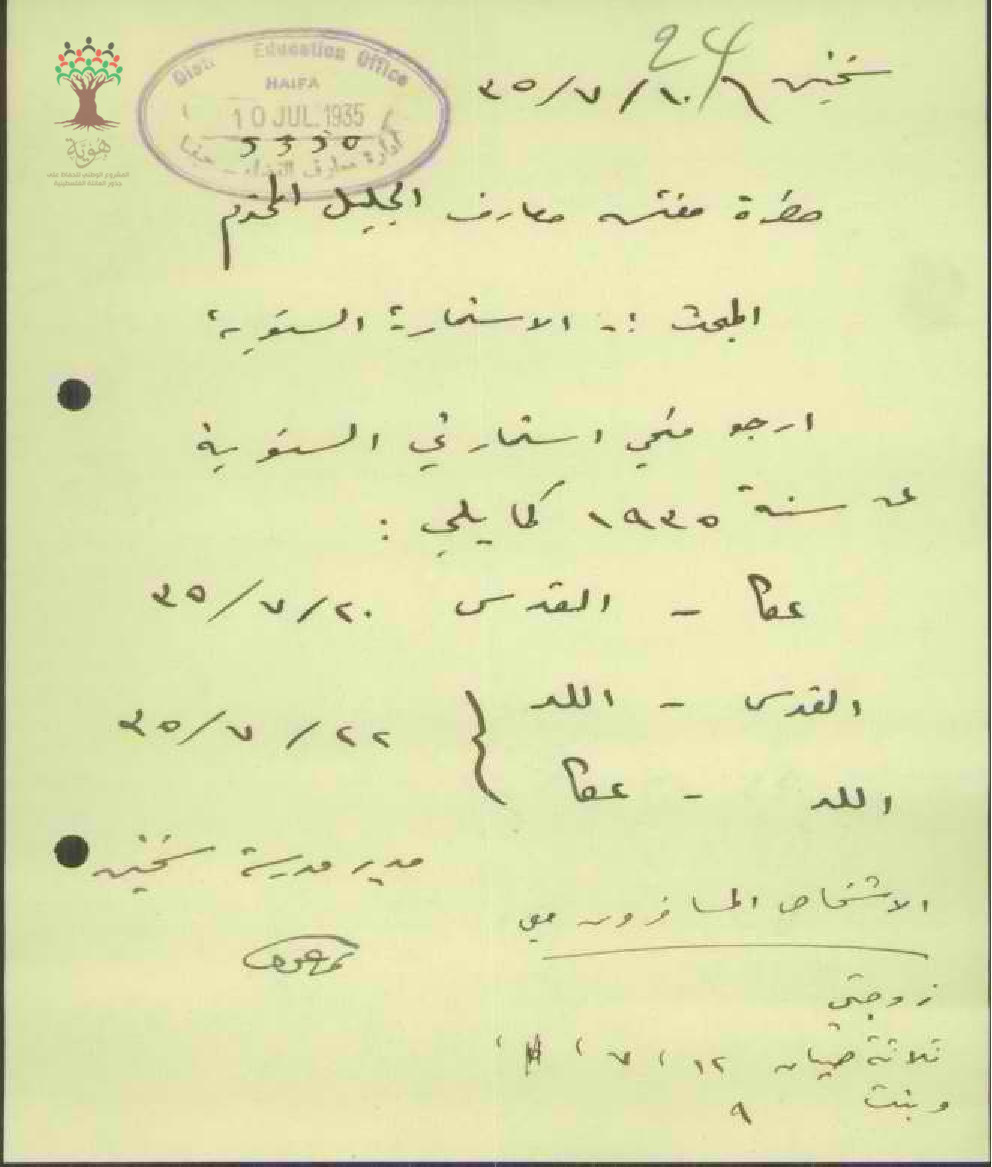 طلب المعلم نمر عبود استمارة سنوية للسفر من مفتش المعارف سنة 1935