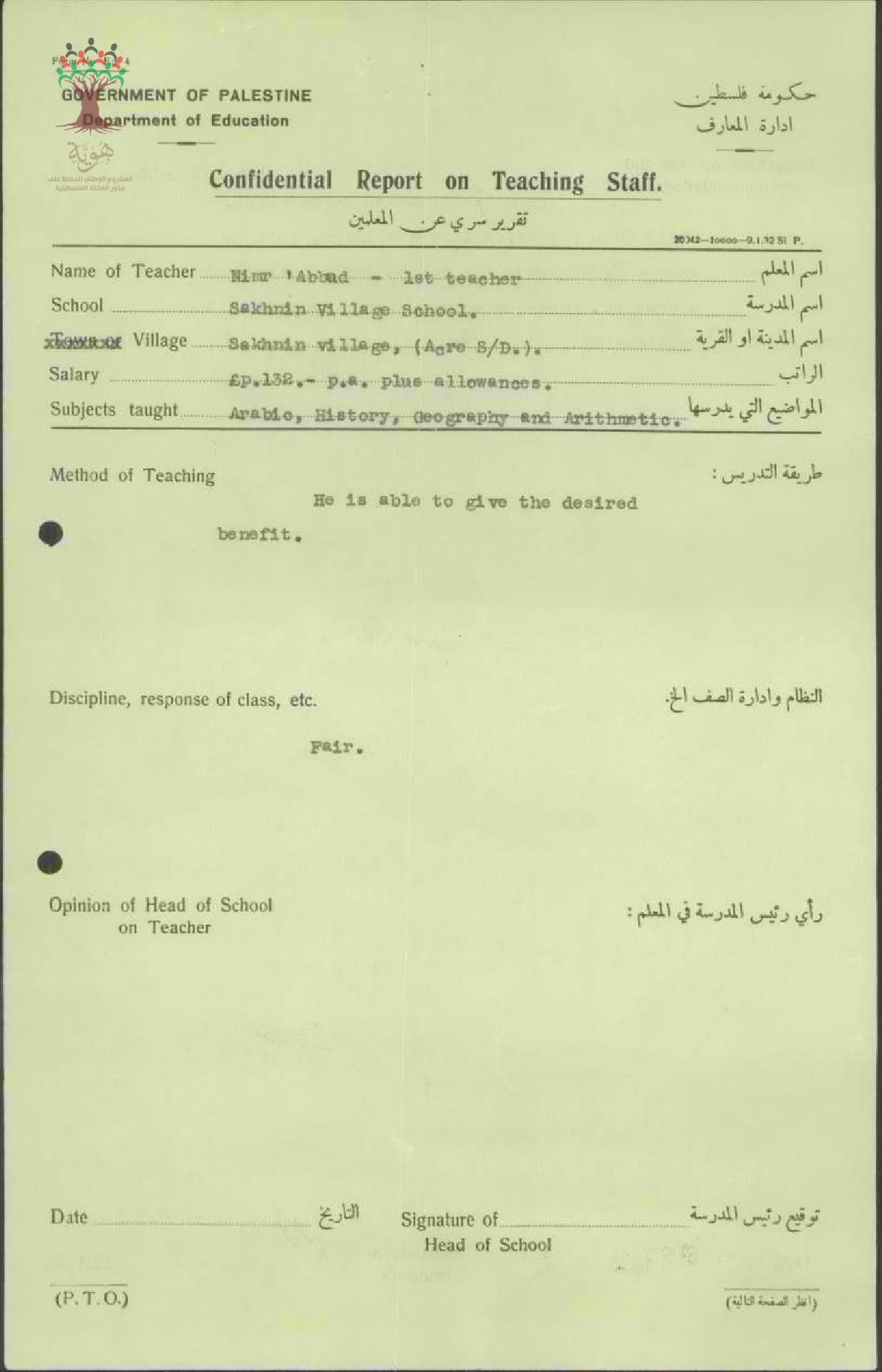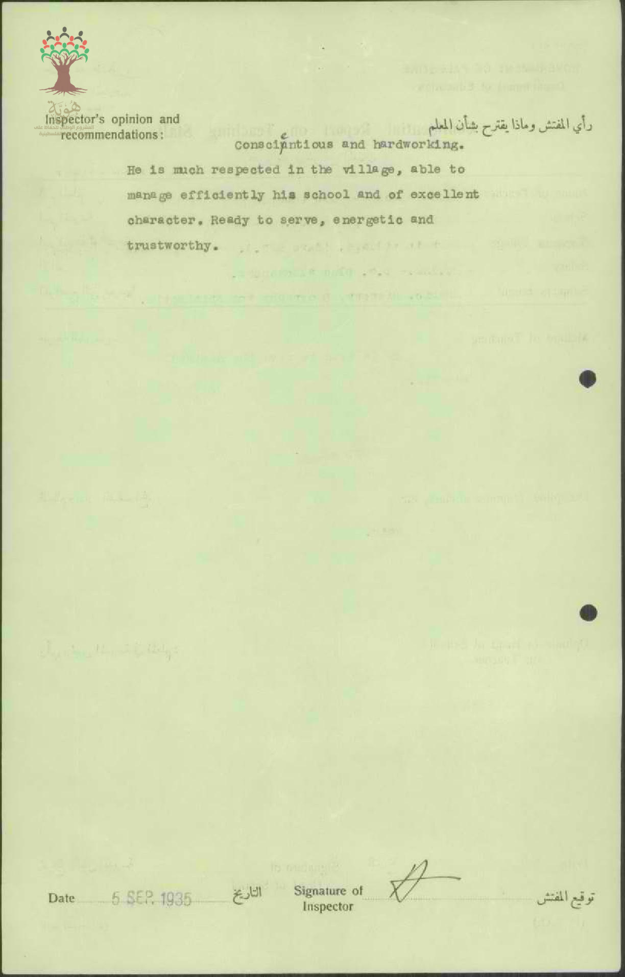 تقرير تفصيلي عن أداء المعلم نمر عبود في مدرسة سخنين سنة 1935