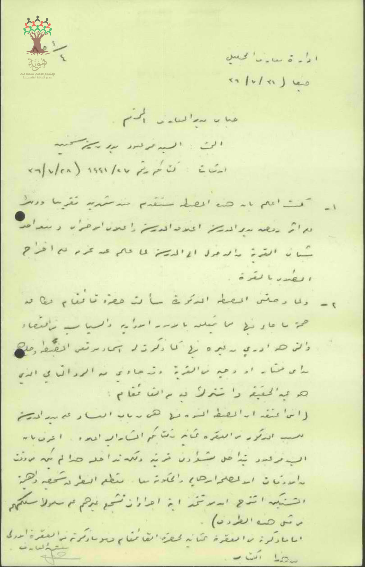 رسالة من مفتش المعارف إلى مدير المعارف يخبره فيها على لاسالة قائمقام عكا بخصوص وضع المعلم نمر عبود في قرية سخنين