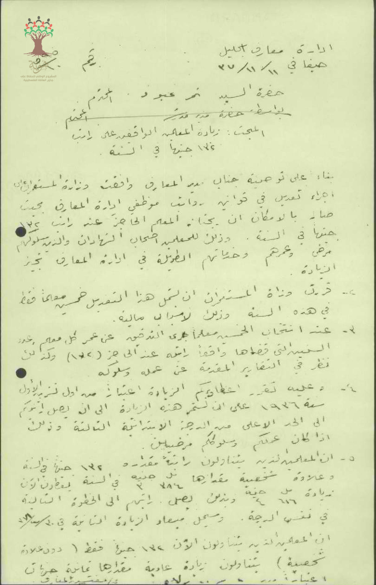 رسالة من مفتش المعارف إلى المعلم نمر عبود يبحث معه زيادة المعلمين الواقفين على راتب 132 جنيهاً في السنة
