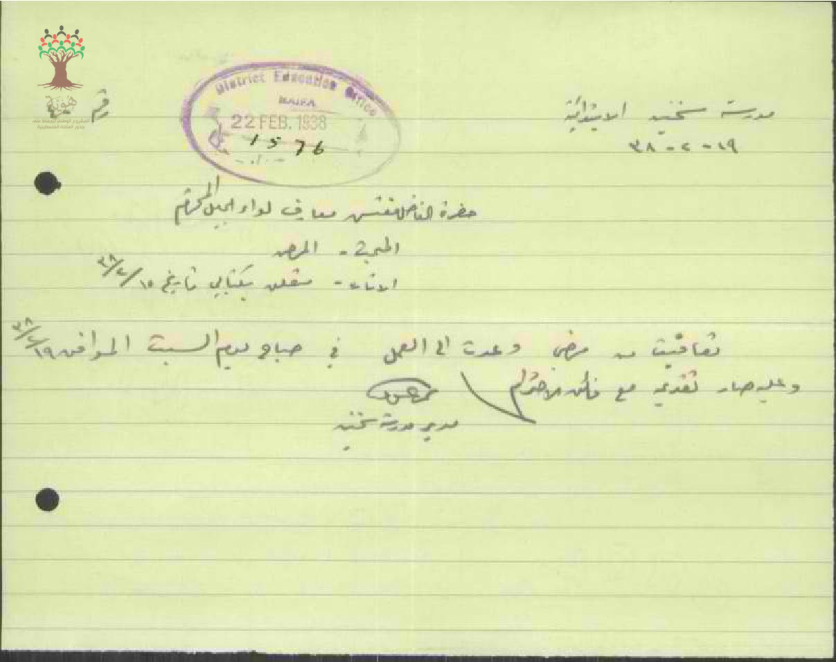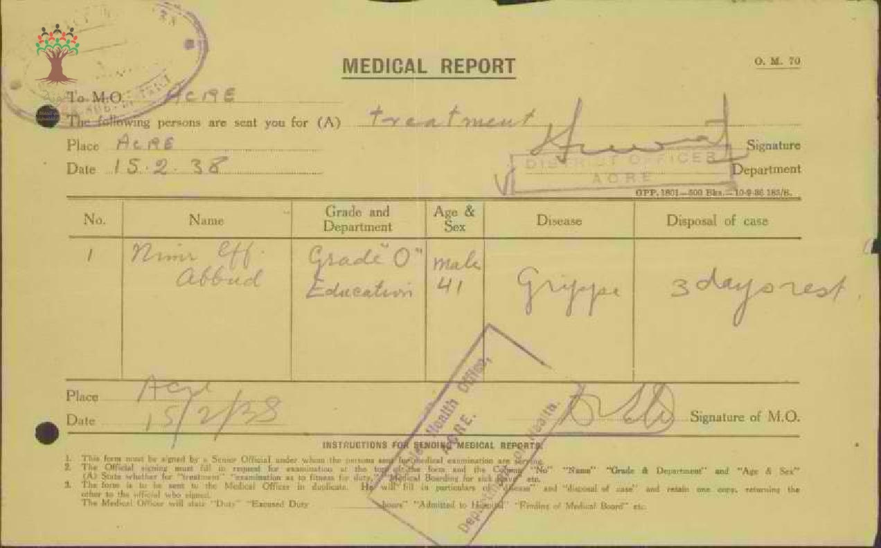 رسالة من المعلم نمر عبود إلى مفتش المعارف يخبره بتعافيه من مرضه وعودته إلى العمل مرفقاً التقرير الطبي