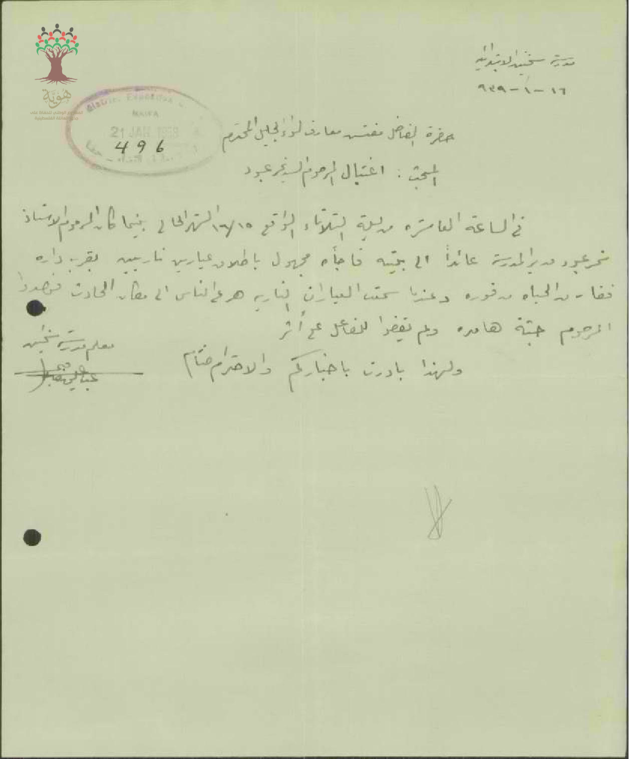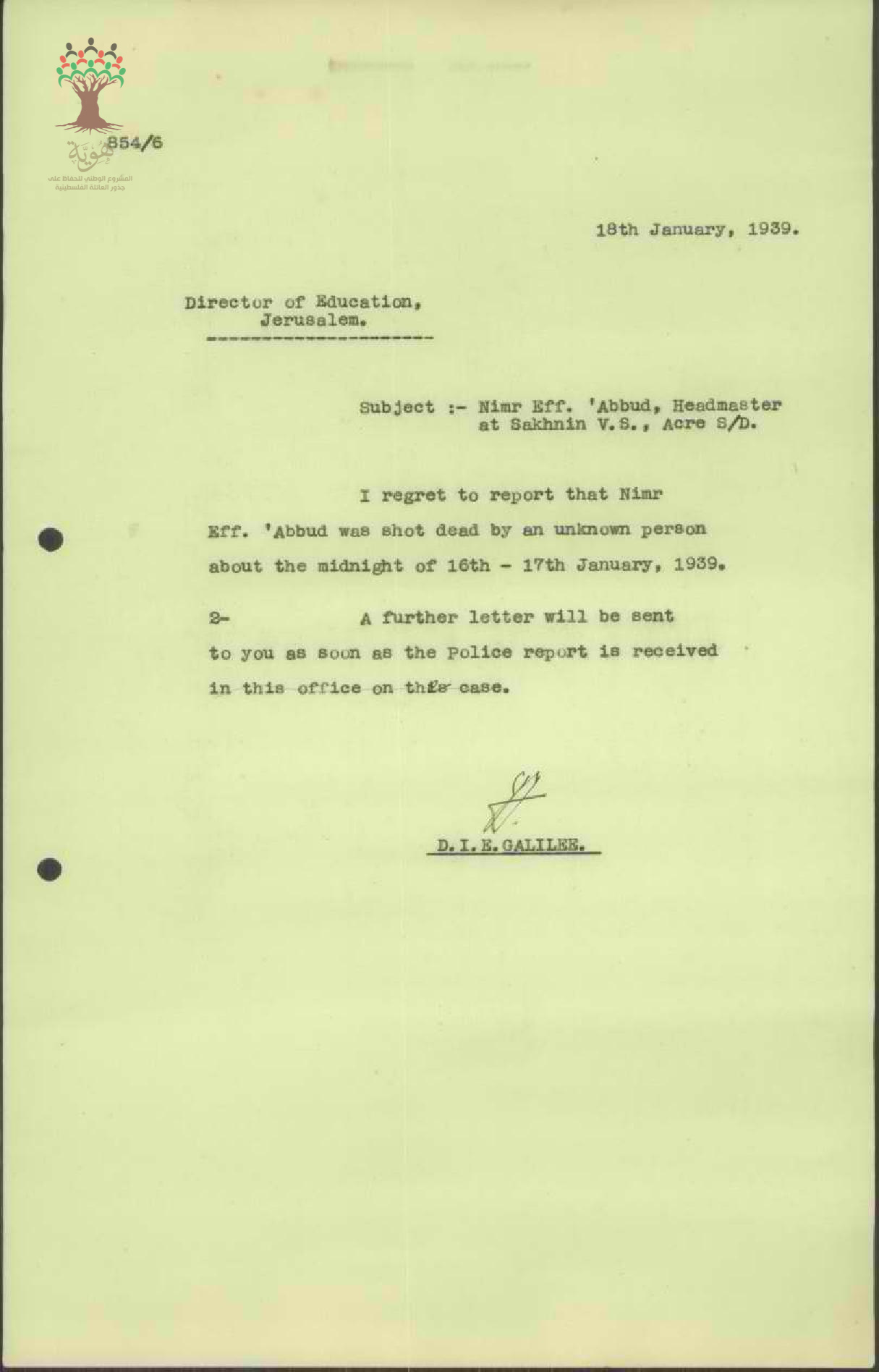 رسالة من مدير مدرسة سخنين إلى مفتش المعارف يخبره بأمر اغتيال المعلم نمر عبود سنة 1939