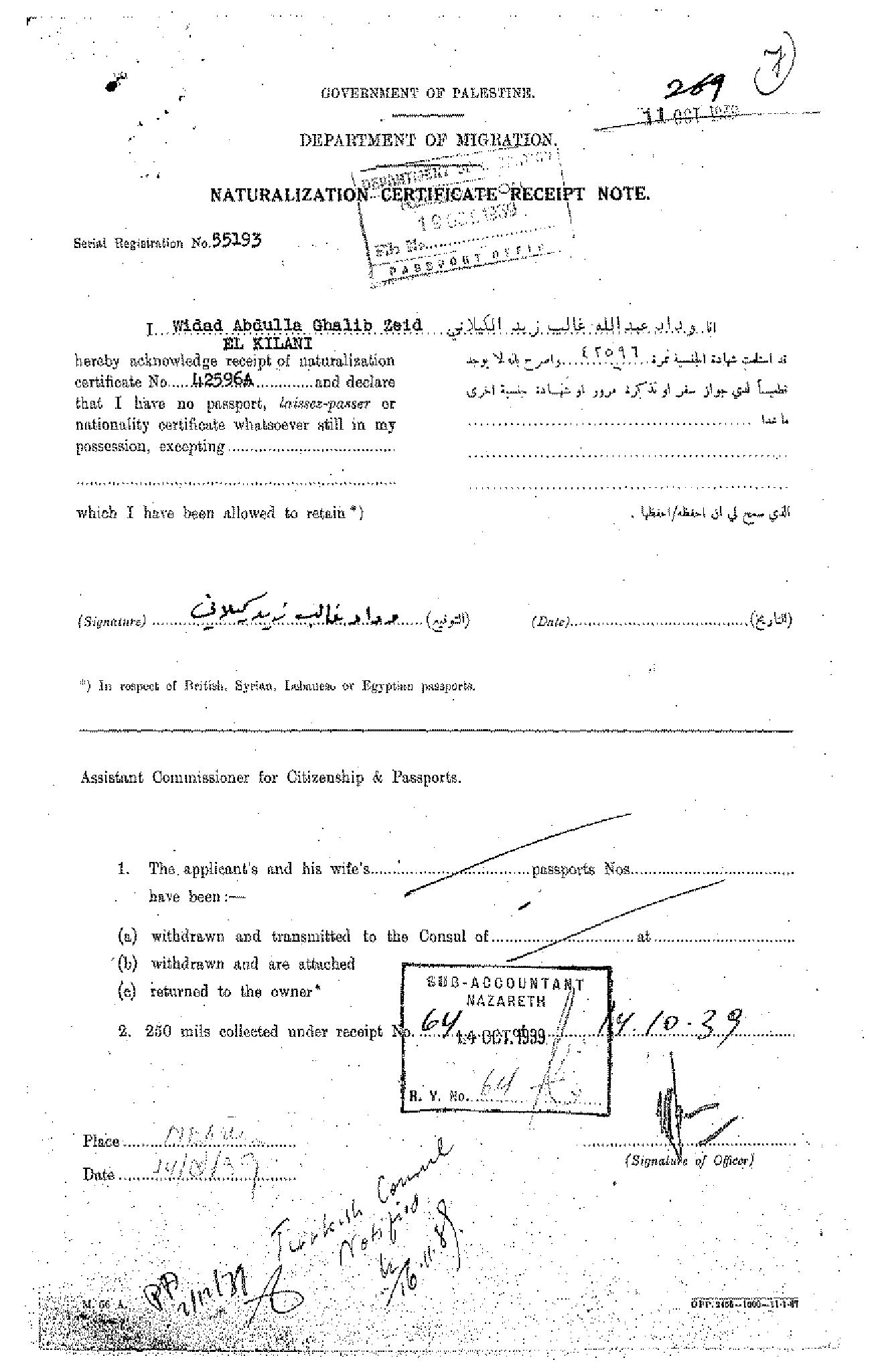 إيصال موقع من وداد عبد الله غالب زيد الكيلاني باستلام شهادة الجنسية الفلسطينية