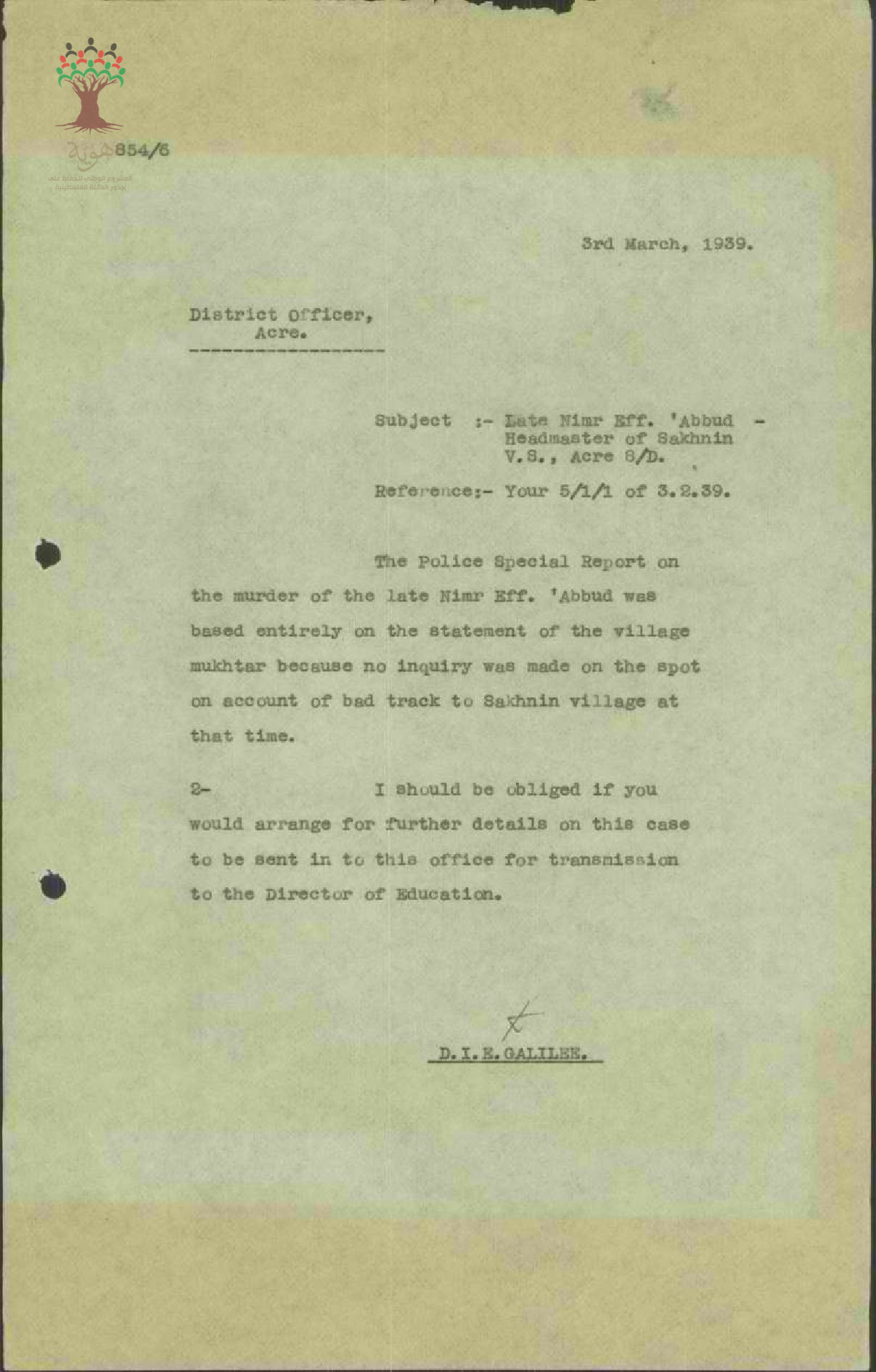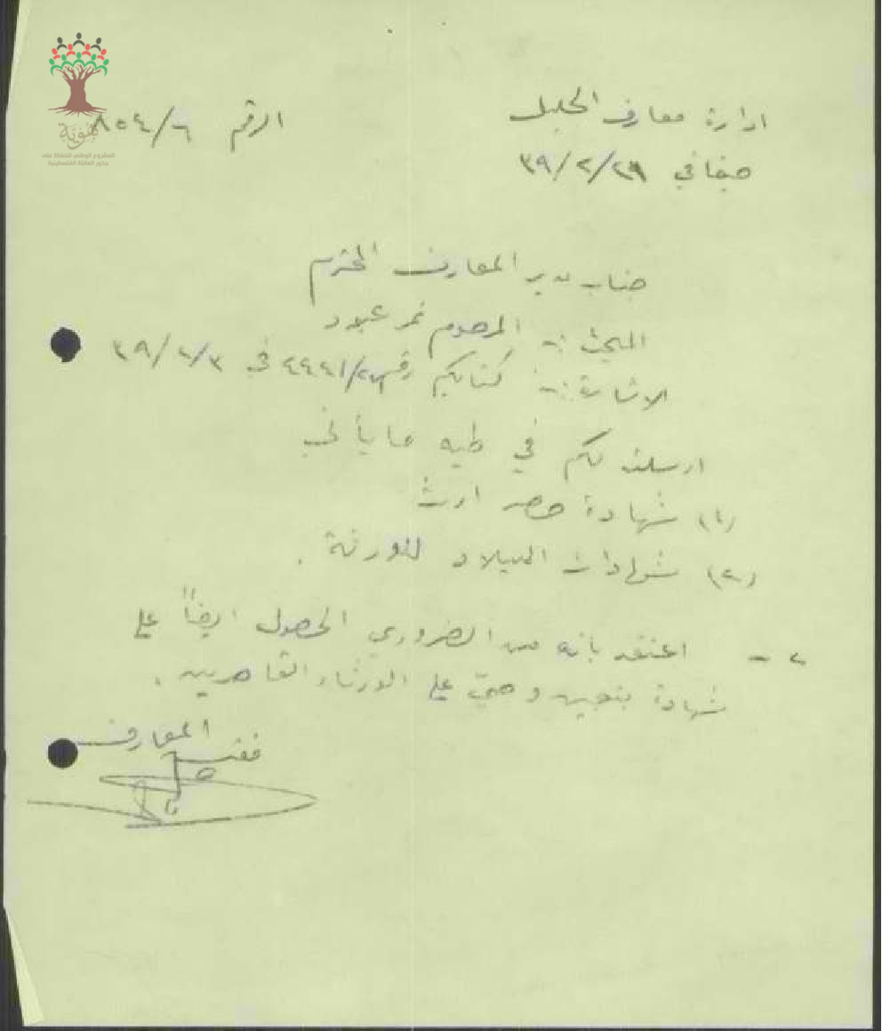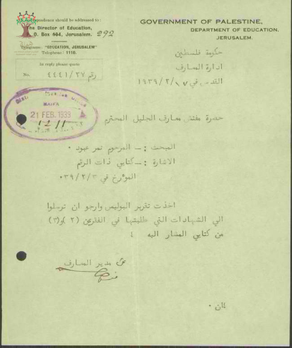 رسالة من مدير المعارف إلى مفتش المعارف يخبره بحصوله على تقرير البوليس ويرجو ارسال الشهادات المطلوبة مسبقاً