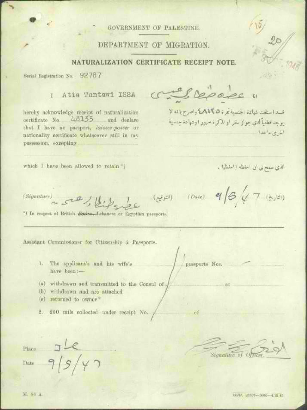 إيصال موقع من عطية طنطاوي عيسى باستلام شهادة الجنسية الفلسطينية