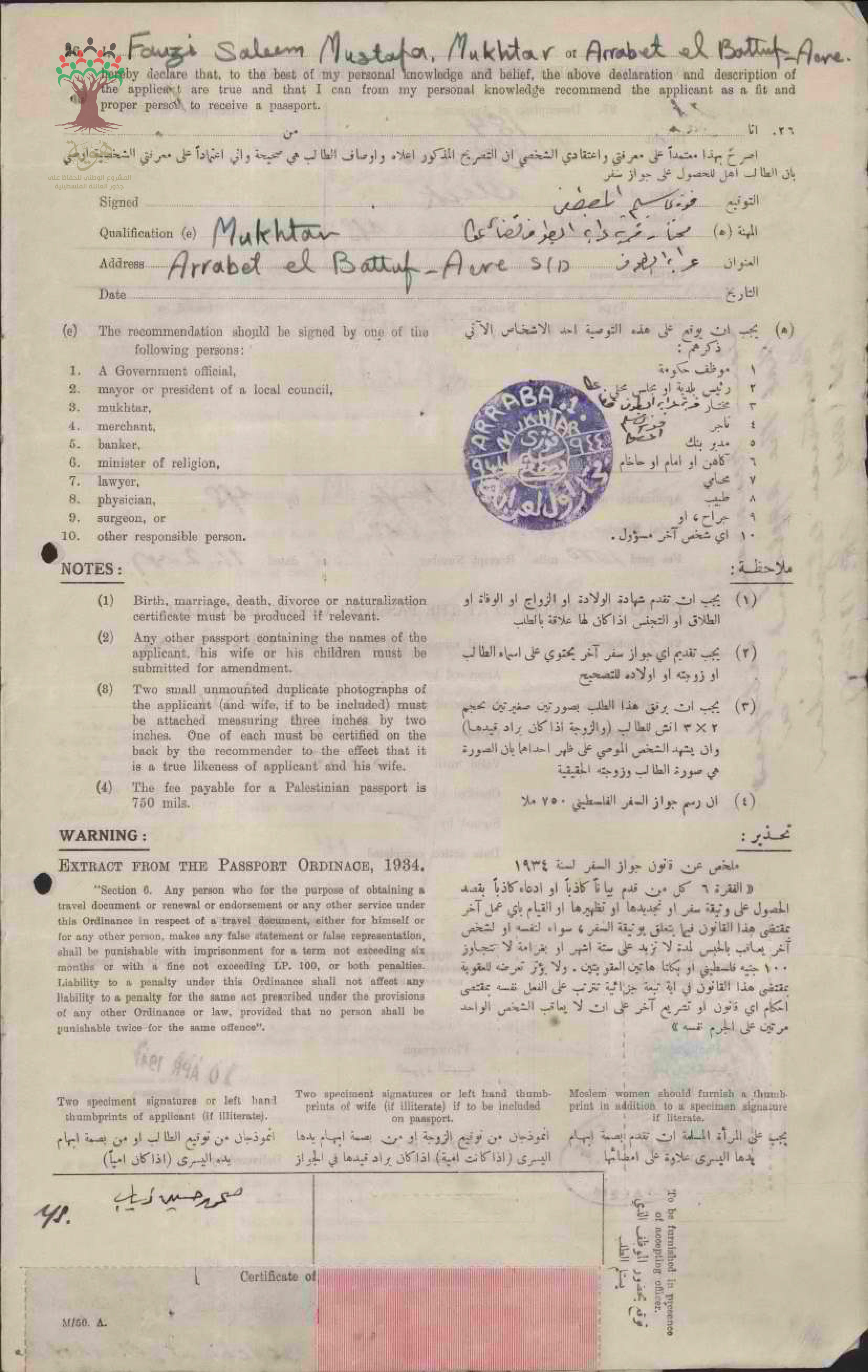 طلب جواز سفر فلسطيني ل محمد حسين دياب مواليد عرابة البطوف سنة 1910