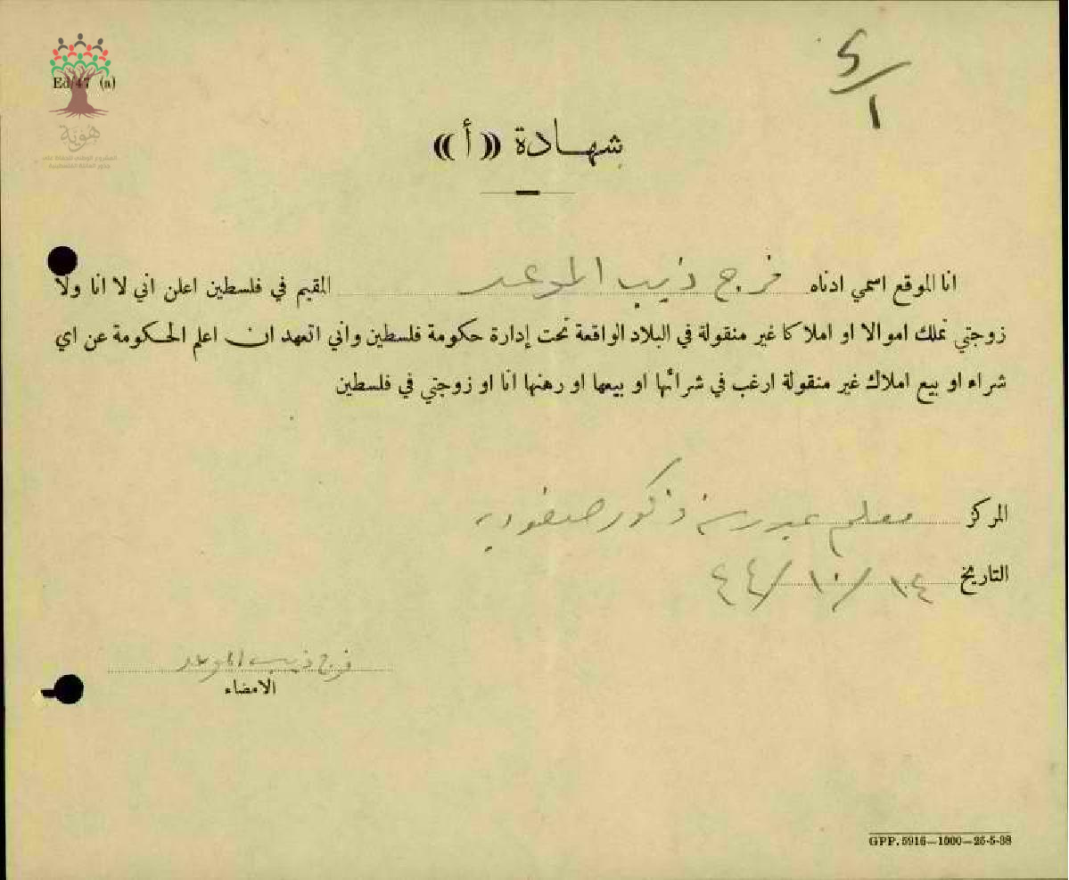 شهادة نفي ملكية-المعلم فرج ذيب موعد-صفورية