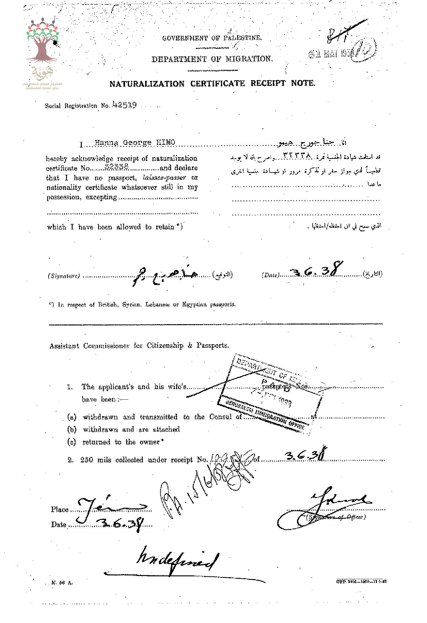 إيصال موقع من حنا هيمو باستلام شهادة الجنسية الفلسطينية
