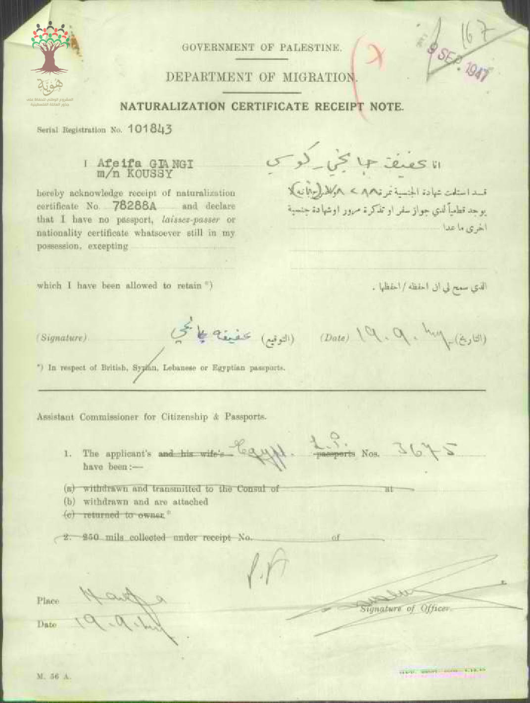 إيصال موقع من عفيفة جانجي كوسا باستلام شهادة الجنسية الفلسطينية