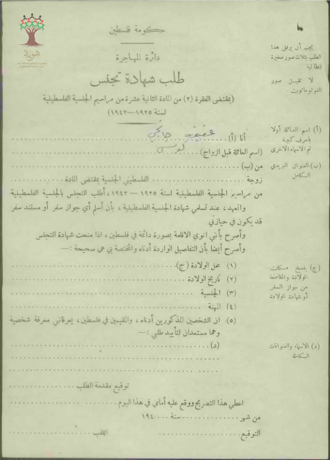 طلب الجنسية الفلسطينية-عفيفة جانجي كوسا-حيفا/سوريا
