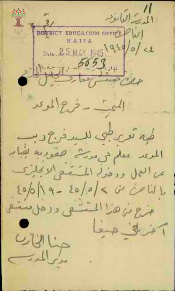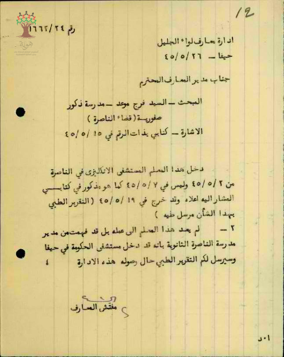 رسالة من مفتش المعارف إلى مدير المعارف يبحث معه الحالة الصحية للمعلم فرج موعد مرفقاً التقرير الطبي