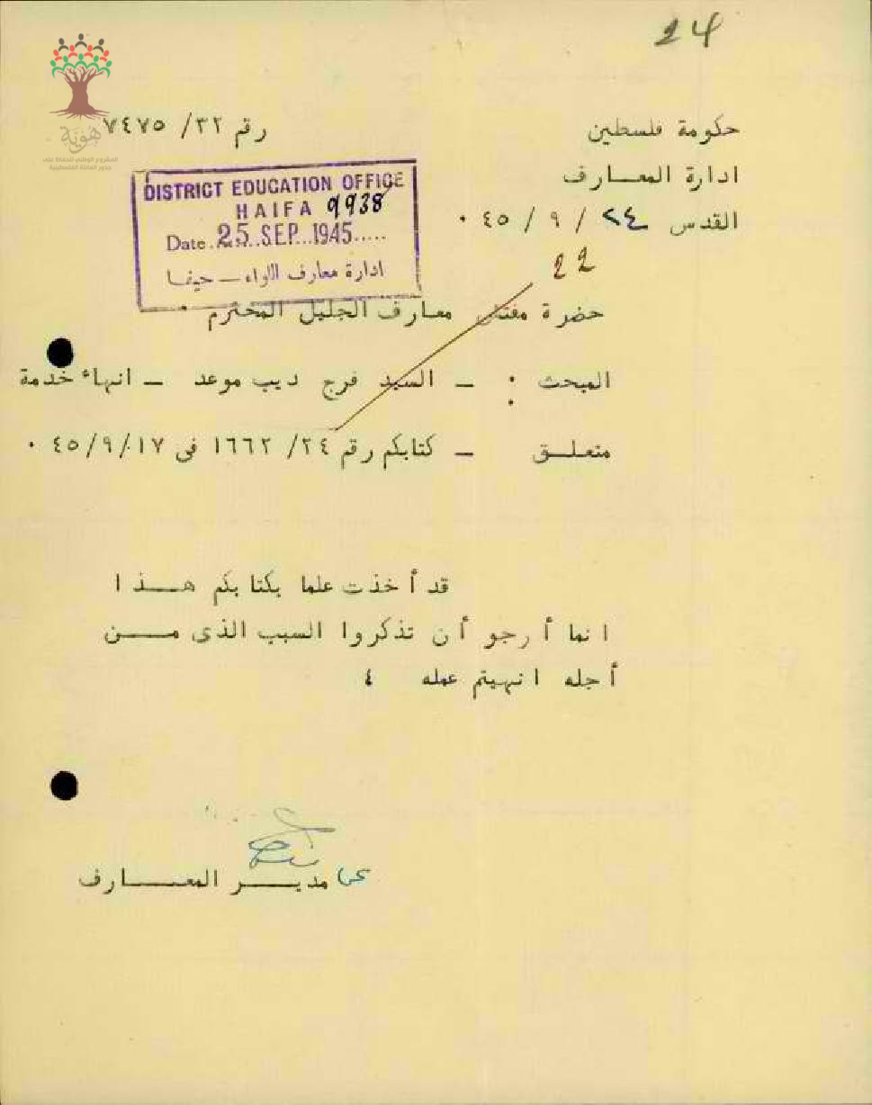 رسالة من مدير المعارف إلى مفتش المعارف يطلب منه ذكر أسباب انهاء عمل المعلم فرج موعد
