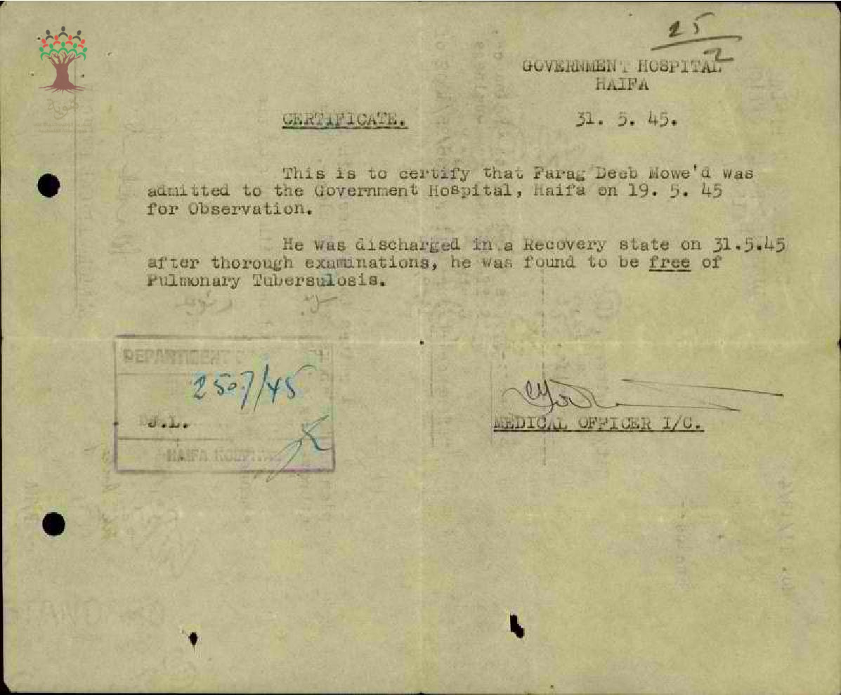 شهادة من المستشفى الحكومي في حيفا عن دخول المعلم فرج موعد المستشفى في تاريخ 19/5/1945 وخروجه منها في تاريخ 31/5/1945