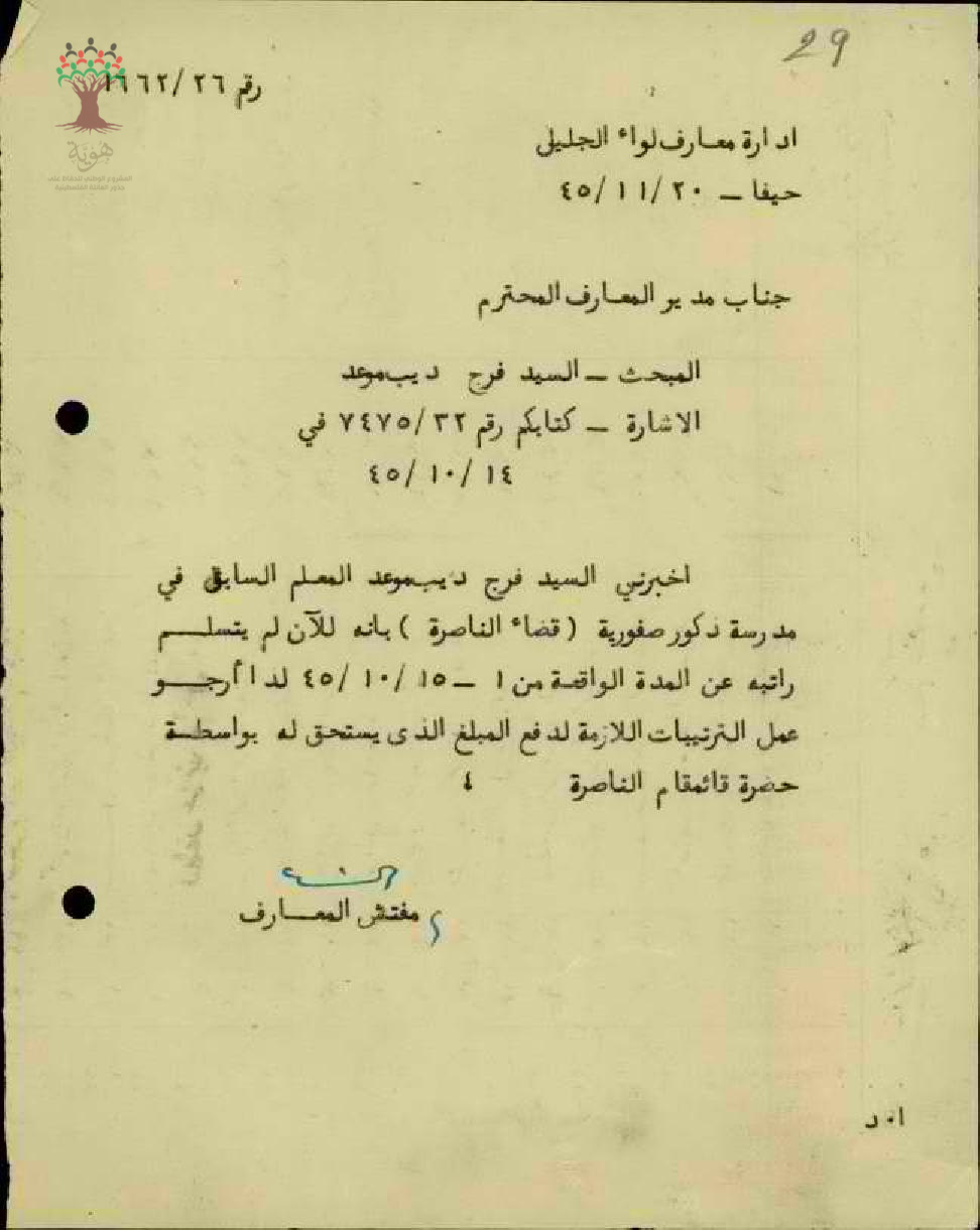 رسالة من مفتش المعارف إلى مدير المعارف يبحث معه أمر عدم استلام المعلم فرج موعد راتبه عن المدة الواقعة بين 1-15/10/1945