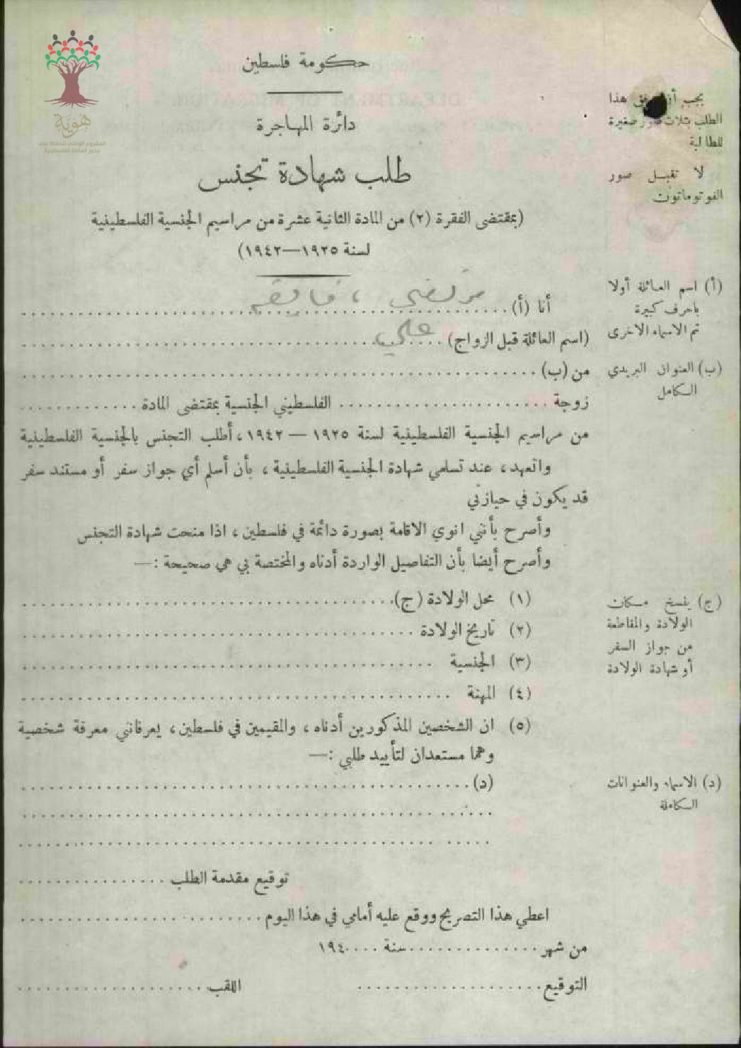 طلب الجنسية الفلسطينية-فايقة علي مرتضى-يافا/مصر