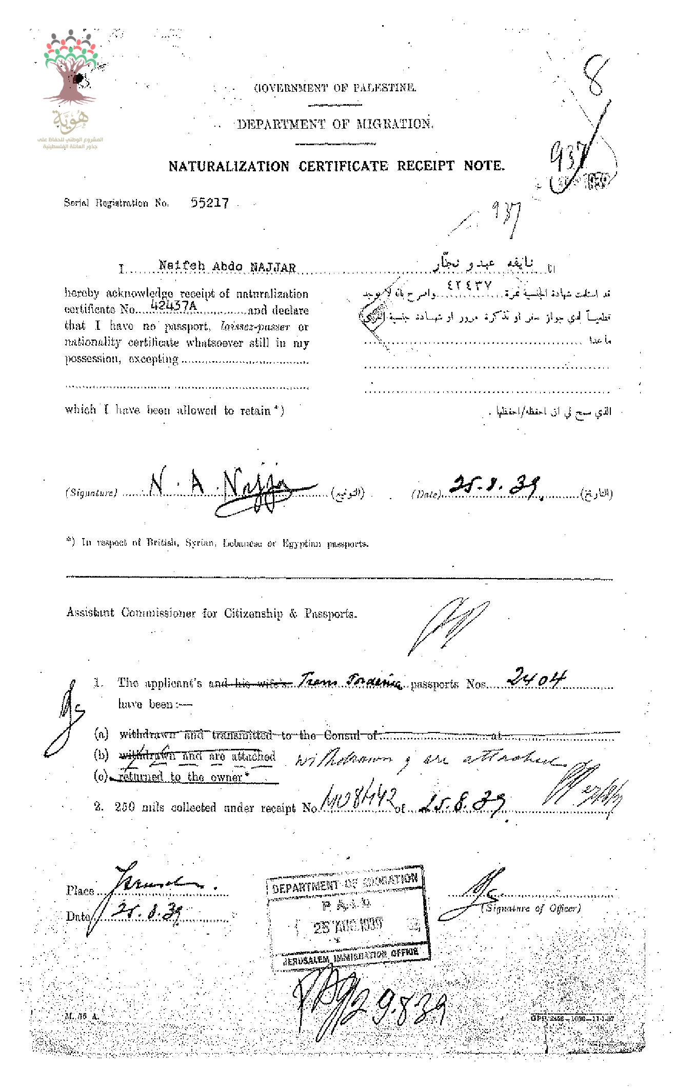 إيصال موقع من نايفة عبدو نجار باستلام شهادة الجنسية الفلسطينية