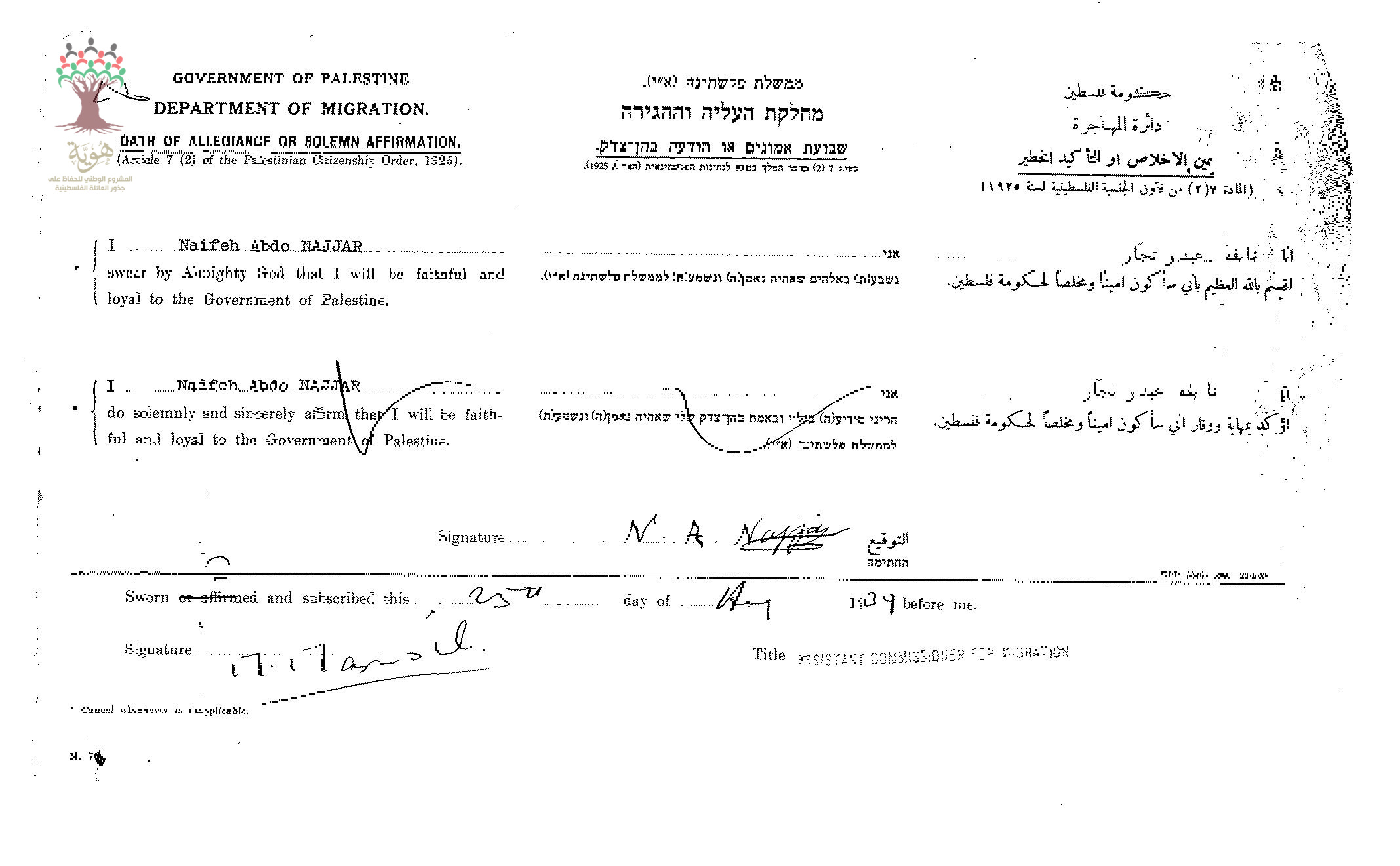 نايفة عبدو نجار توقع على (يمين الإخلاص) للحصول على الجنسية الفلسطينية