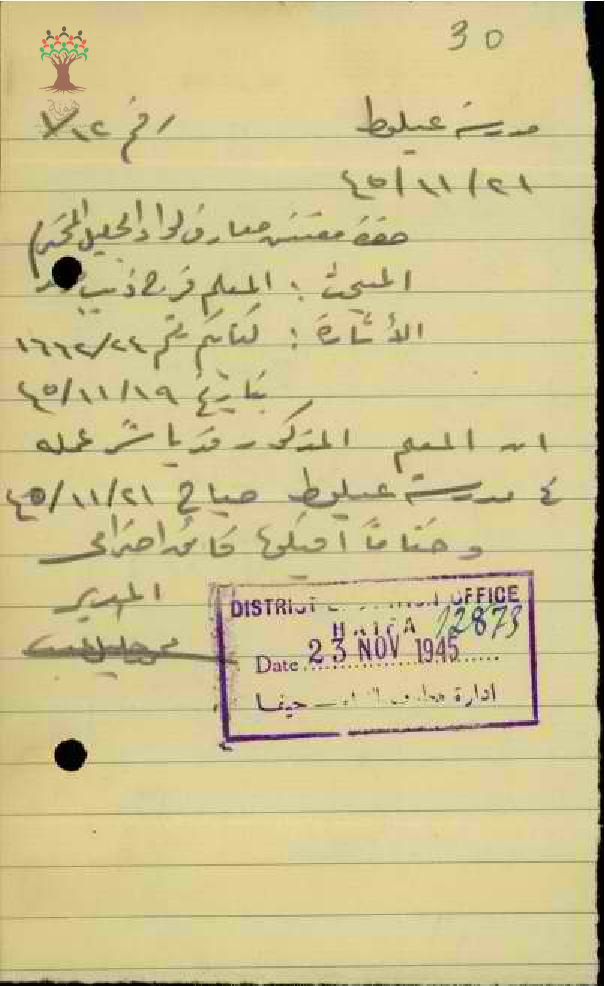 رسالة من مدير مدرسة عيلوط إلى مفتش المعارف يخبره بمباشرة المعلم فرج موعد العمل في المدرسة في صباح 21/11/1945