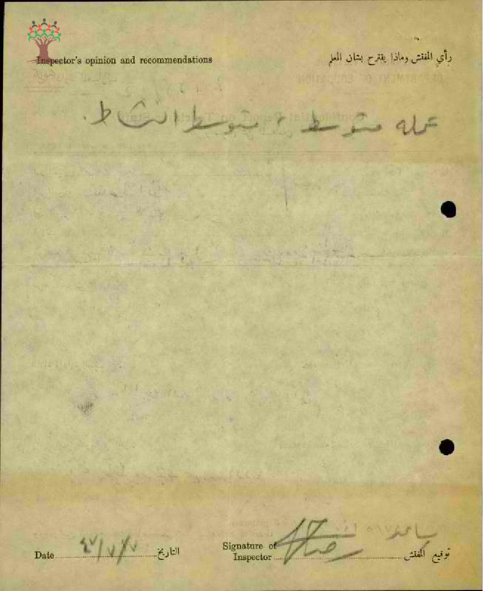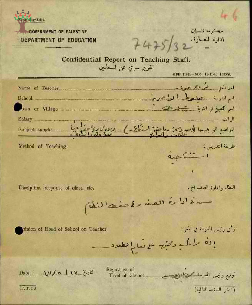 تقرير تفصيلي عن أداء المعلم فرج موعد في مدرسة عيلوط سنة 1947