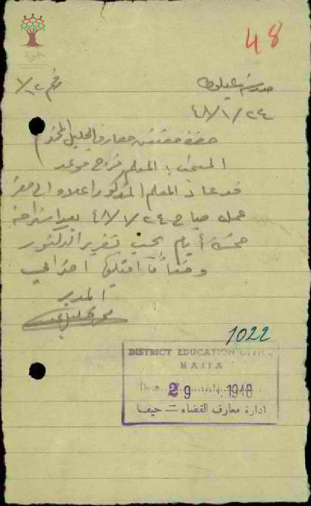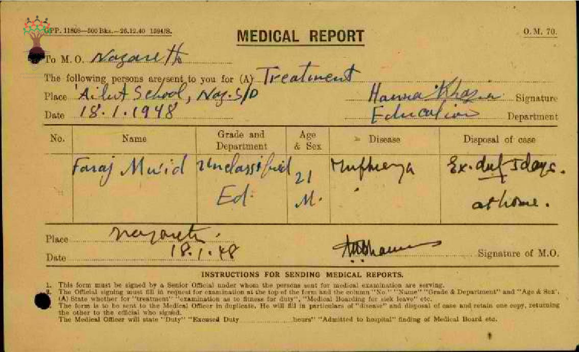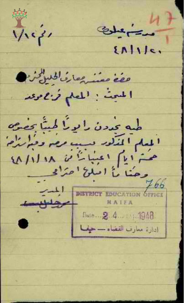 رسالة من مدير مدرسة عيلوط إلى مفتش المعارف يبحث معه مرض المعلم فرج موعد مرفقاً التقرير الطبي