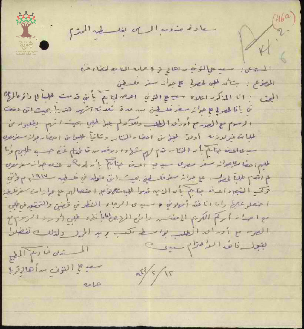 رسالة من سعيد علي التوني الى المندوب السامي للحصول علو جواز سفر فلسطيني