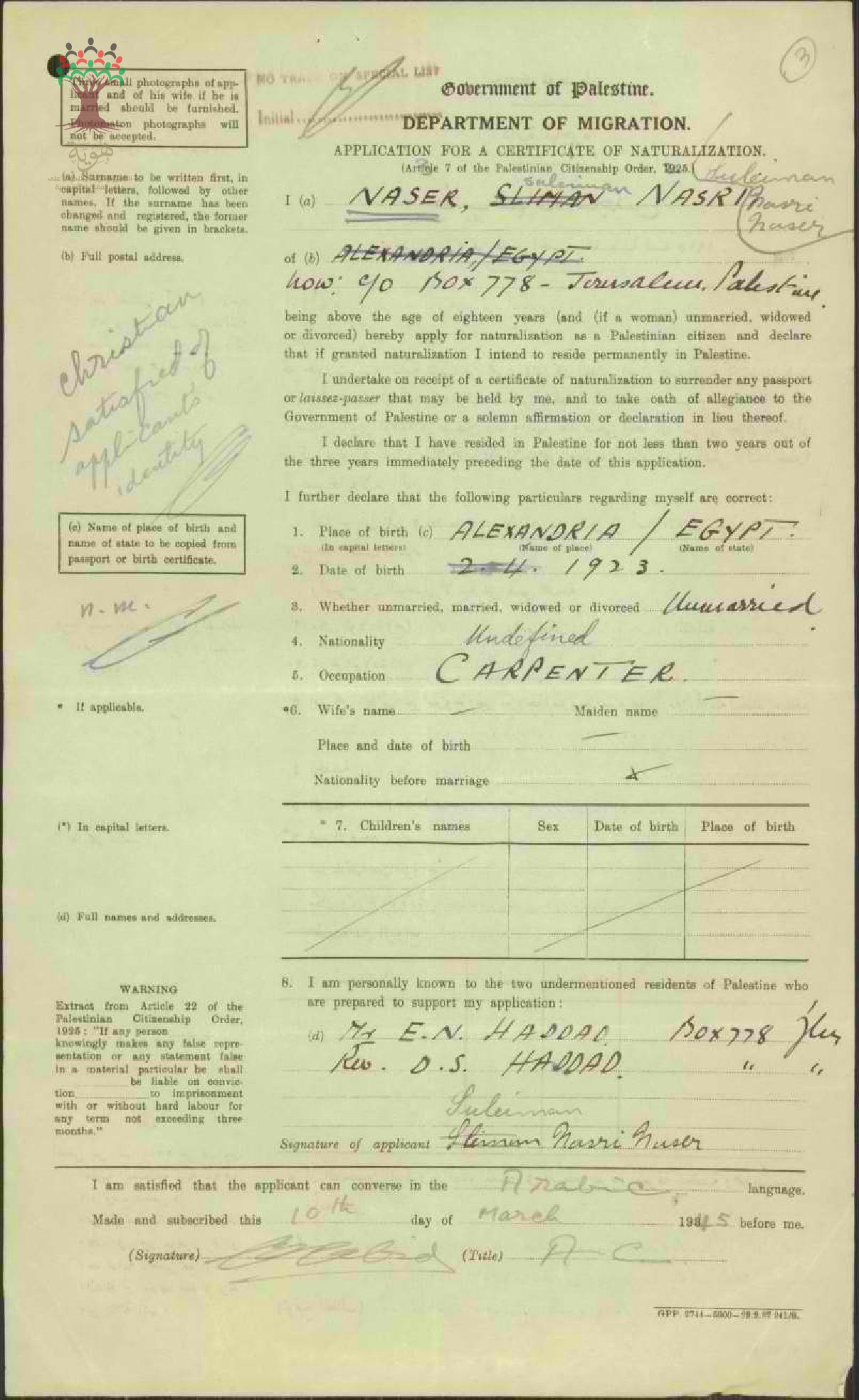 طلب الجنسية الفلسطينية-سليمان نصر-القدس/مصر