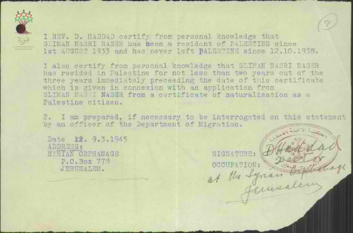 شهادة من سكرتير دار الأيتام ل سليمان نصر بخصوص طلب الجنسية/القدس