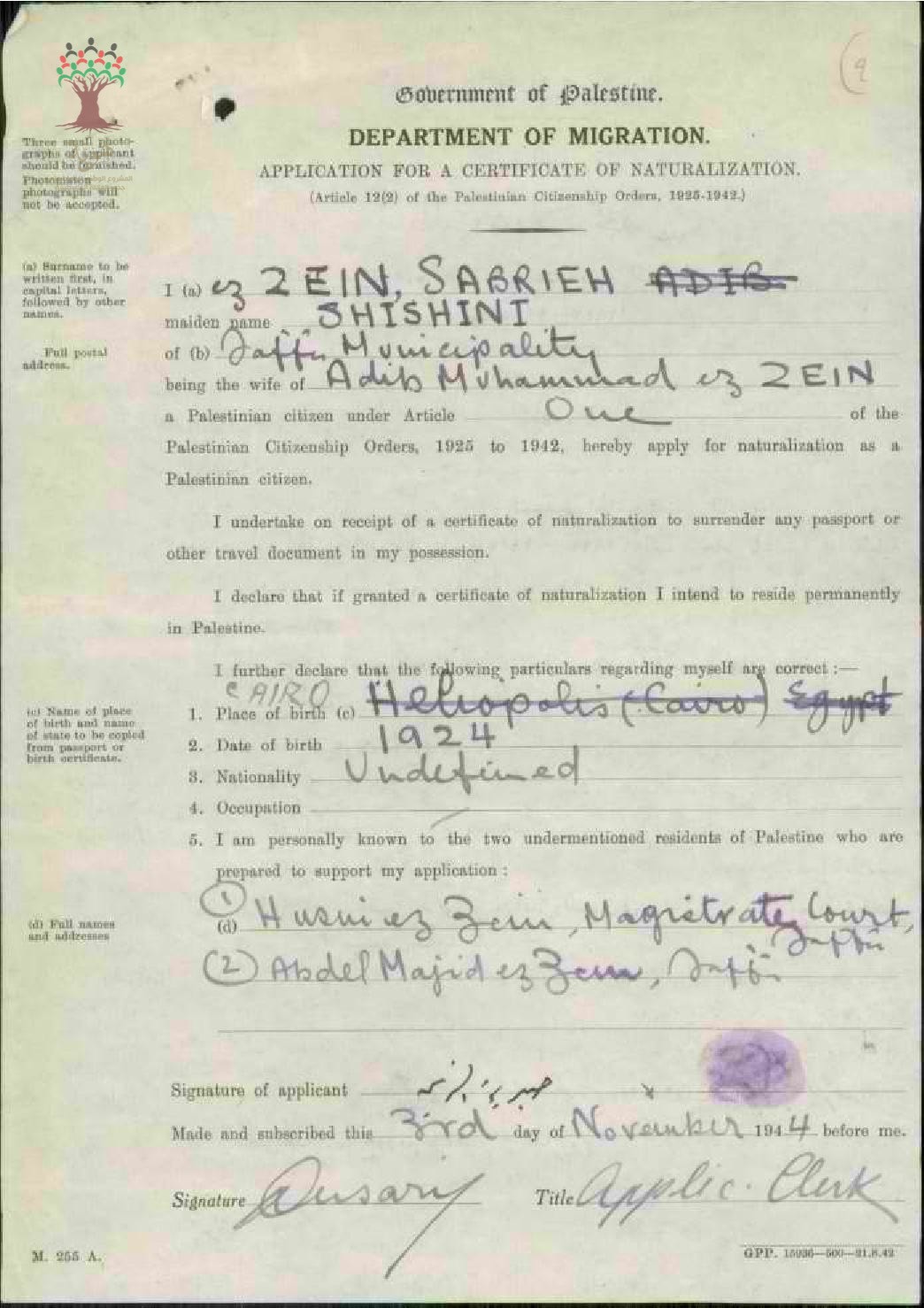 طلب الجنسية الفلسطينية-صبرية الشيشيني الزين-يافا/القاهرة
