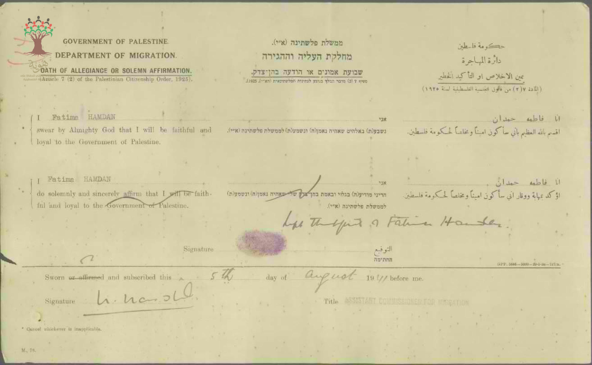 فاطمة نجار حمدان توقع على (يمين الإخلاص) للحصول على الجنسية الفلسطينية