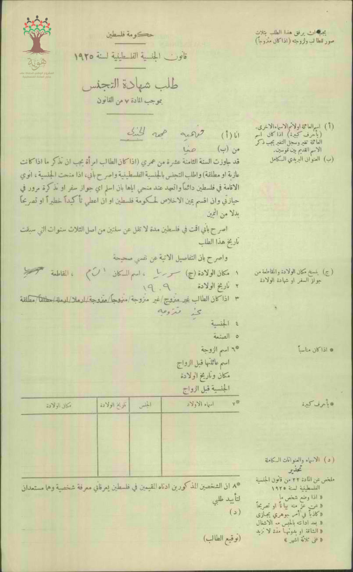 طلب الجنسية الفلسطينية-فهيمة جمعة جندلي-حيفا/سوريا