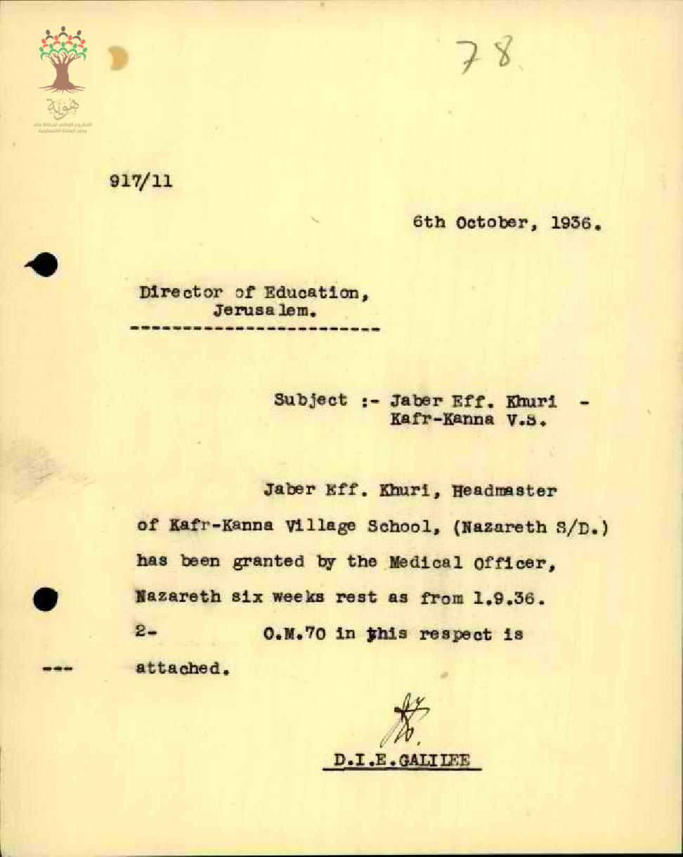 رسالة من مفتش المعارف إلى مدير المعارف يبحث معه مرض المعلم جابر خوري