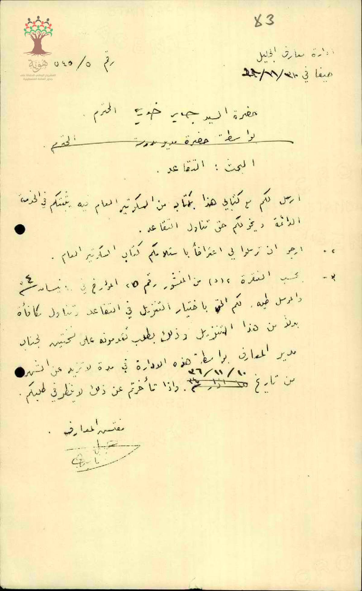 رسالة من مفتش المعارف إلى المعلم جابر خوري يبحث معه أمر التقاعد