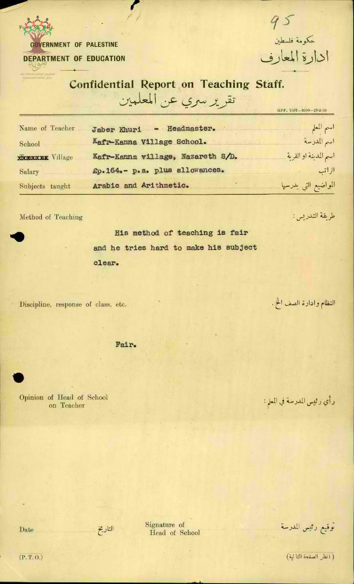 تقرير تفصيلي عن أداء المعلم جابر خوري في مدرسة كفر كنا سنة 1939