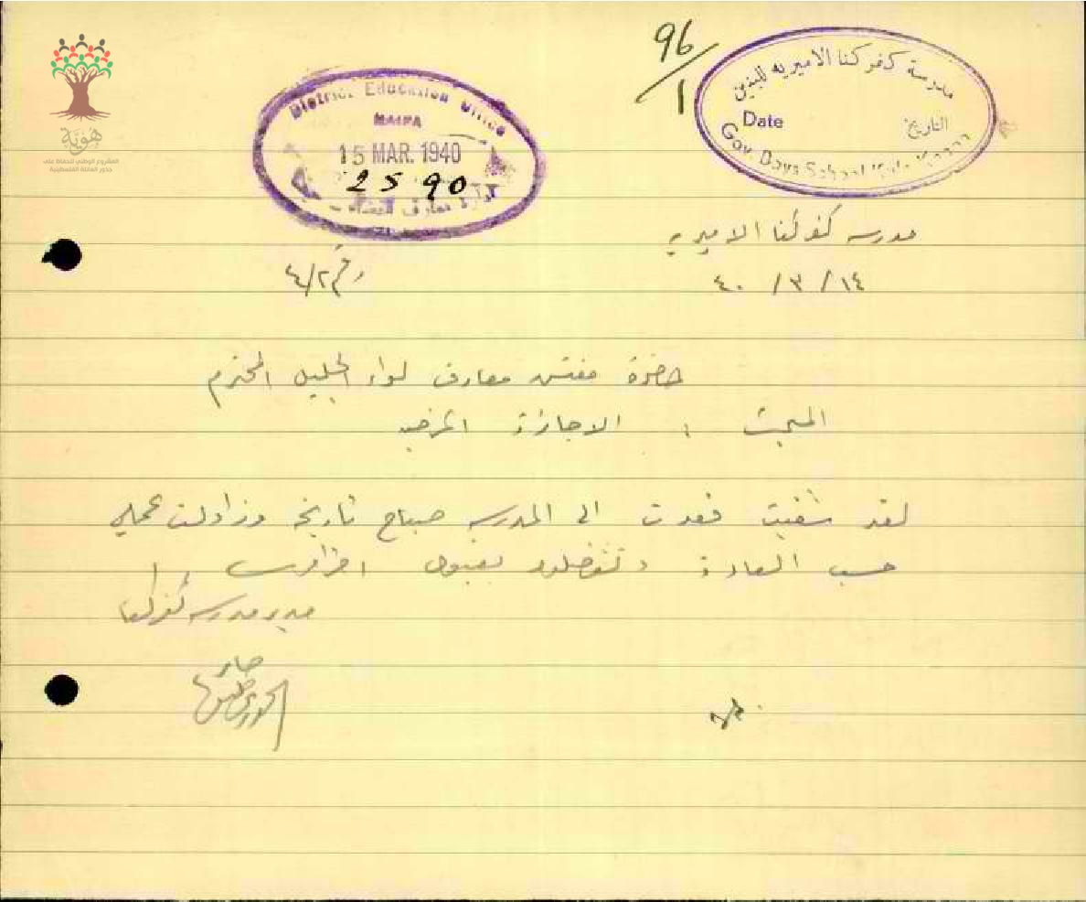 رسائل من المعلم جابر خوري إلى مفتش المعارف يعلمه بتاريخ عودته إلى العمل بعد انتهاء الاجازة المرضية