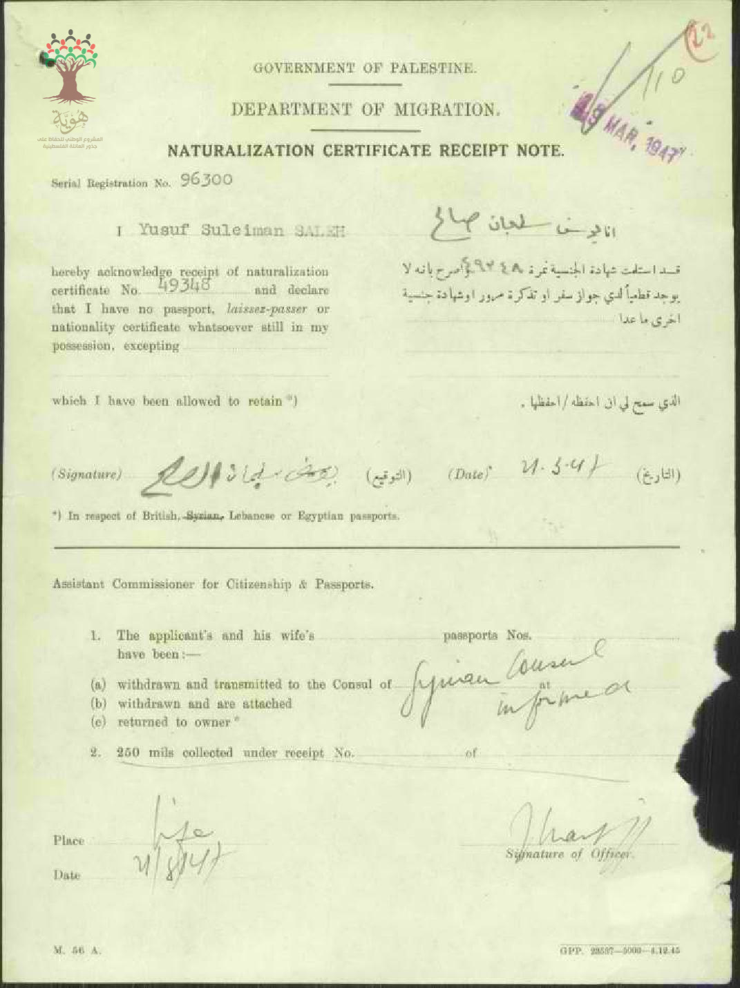 إيصال موقع من يوسف سليمان صالح باستلام شهادة الجنسية الفلسطينية