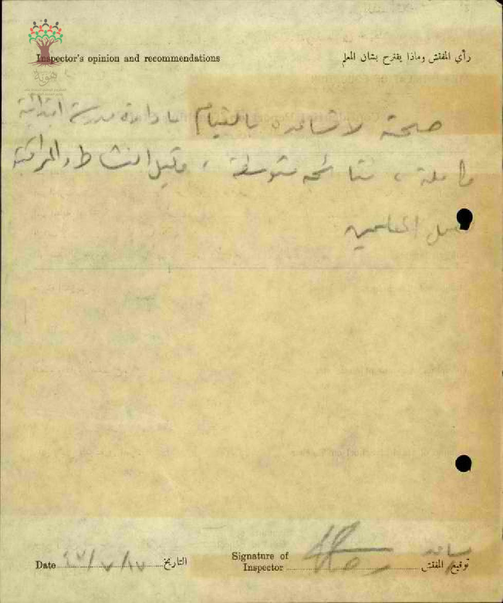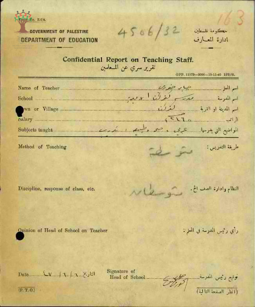 تقرير تفصيلي عن أداء المعلم جابر خوري في مدرسة كفر كنا سنة 1947