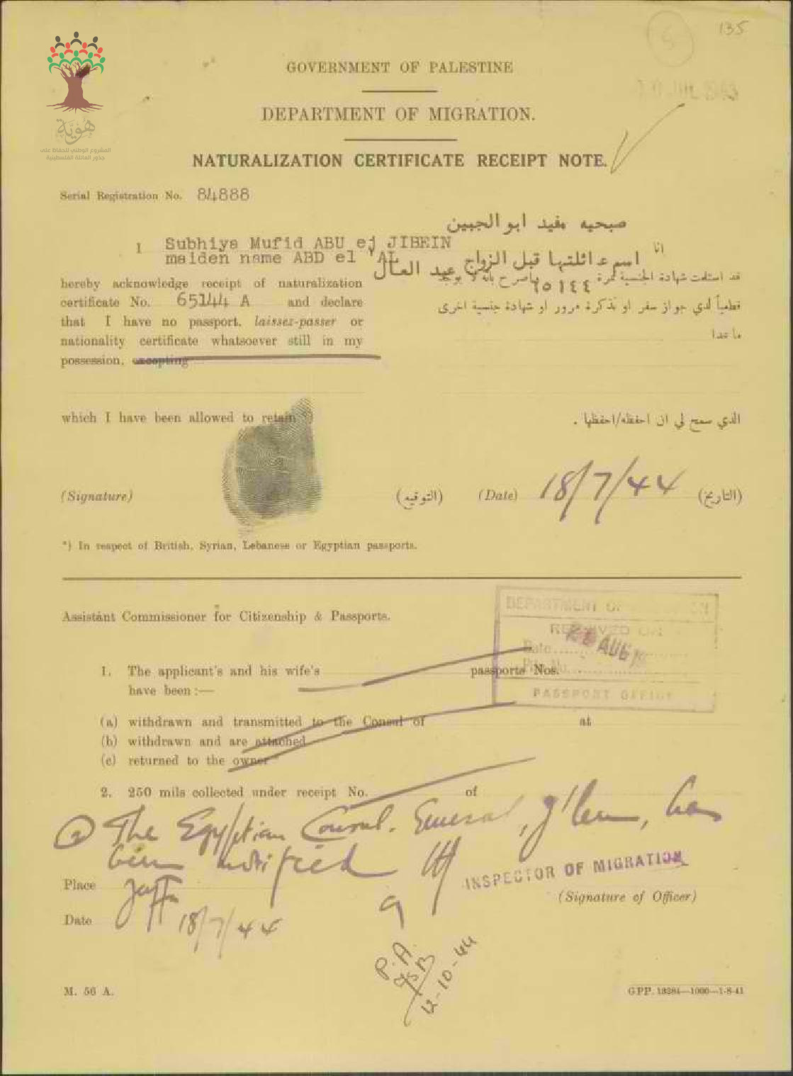 إيصال موقع من صبحية عبد العال أبو الجبين باستلام شهادة الجنسية الفلسطينية
