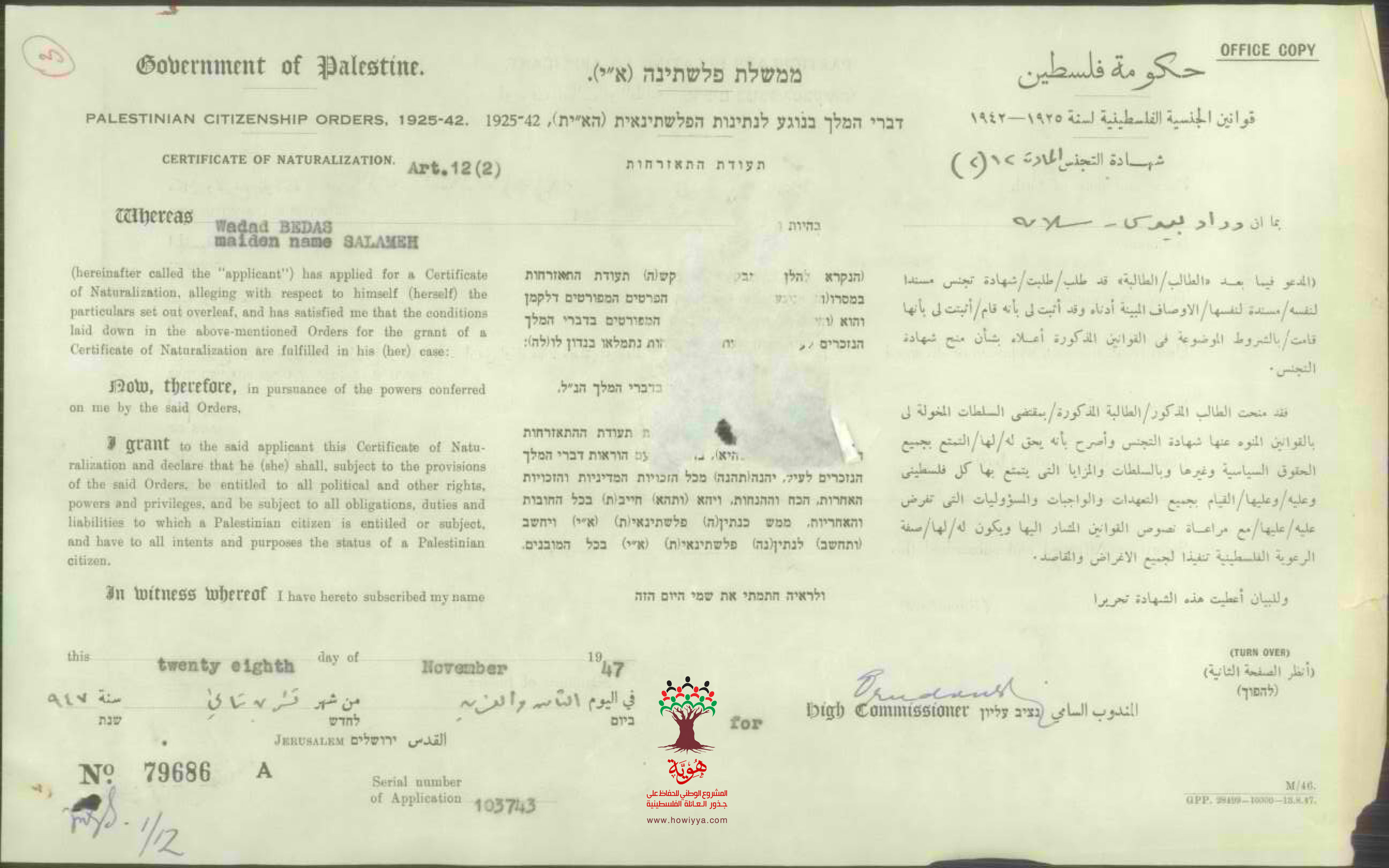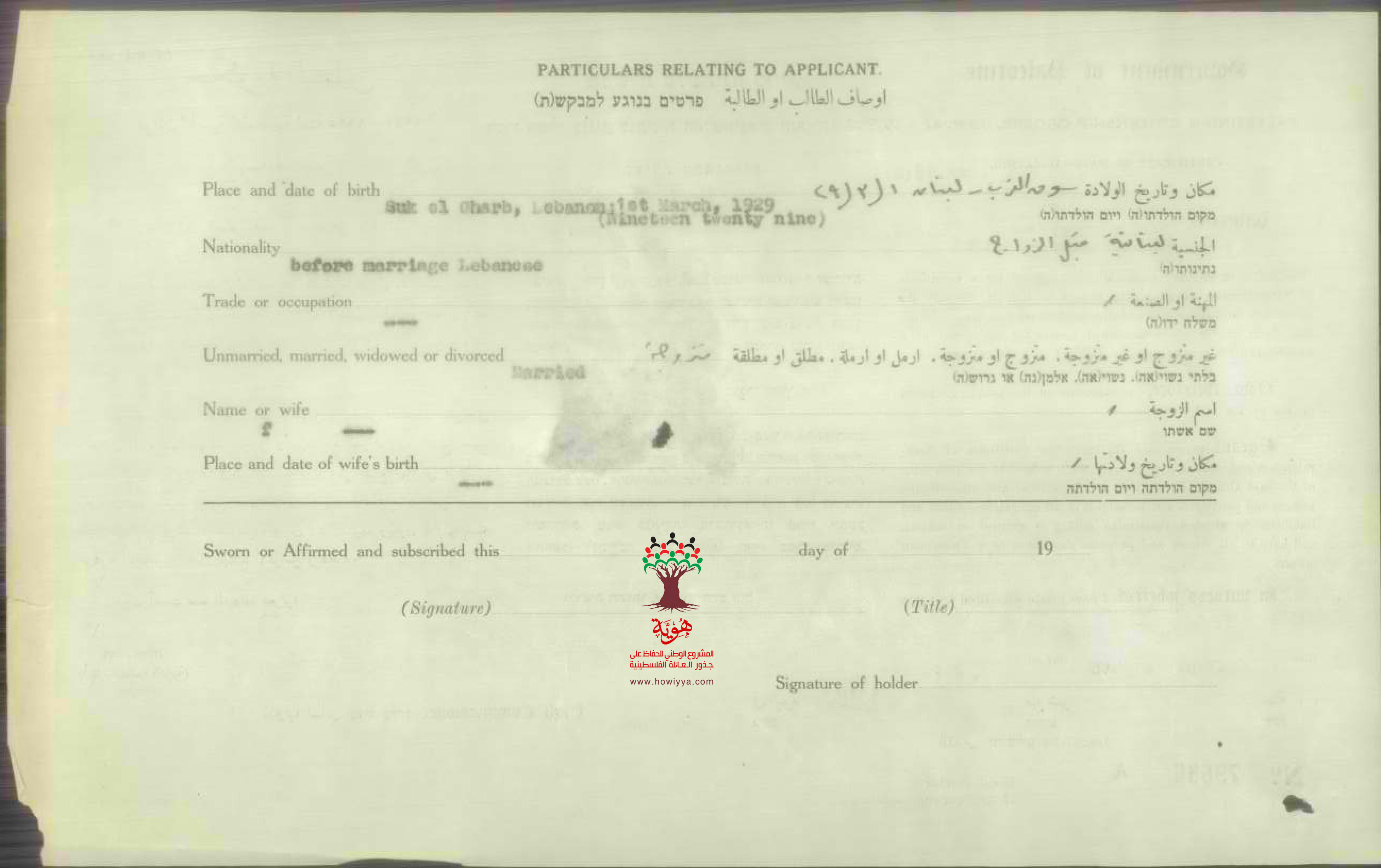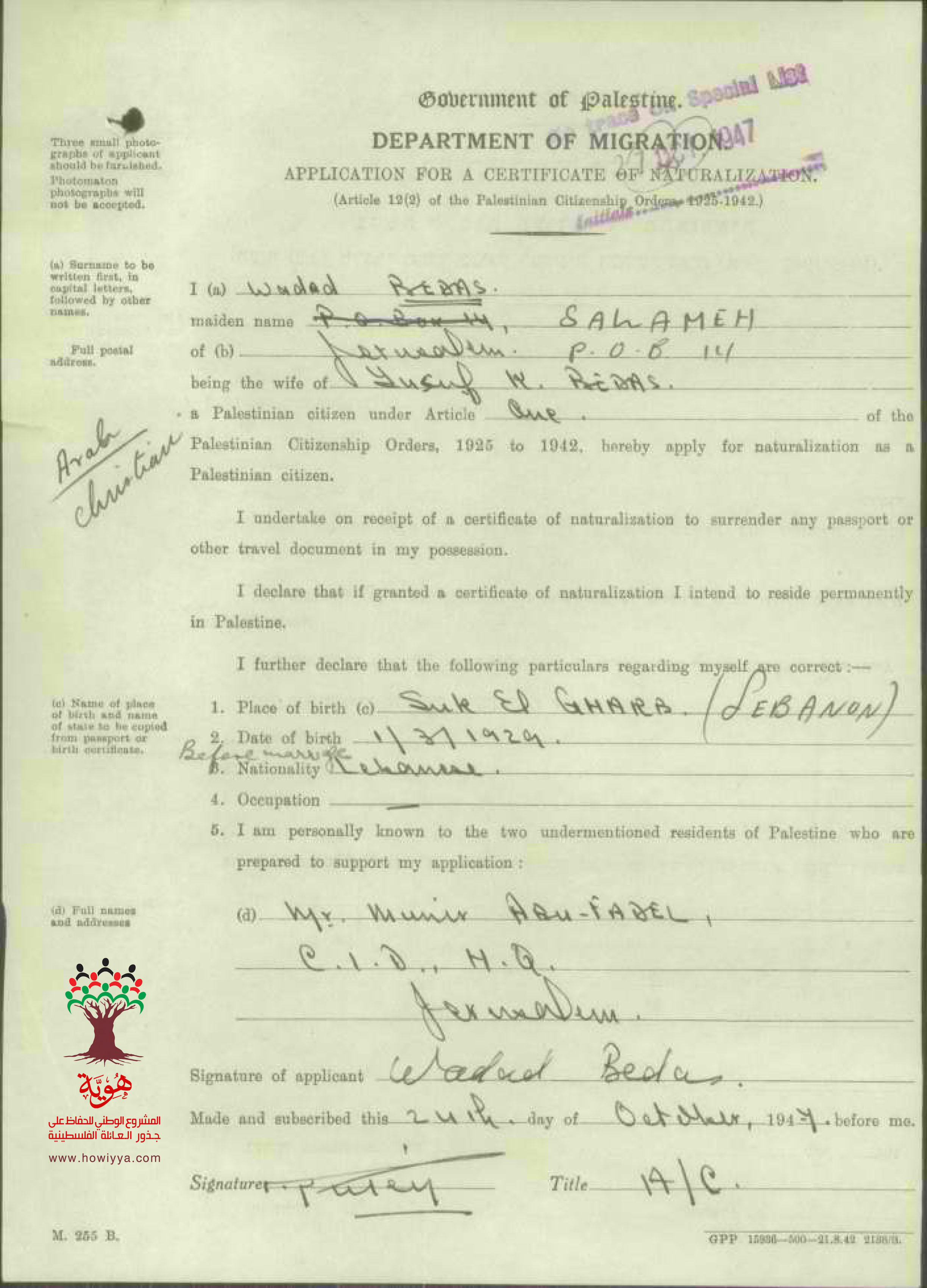 طلب الجنسية - وداد سلامة زوجة يوسف بيدس - لبنان - سوق الغرب
