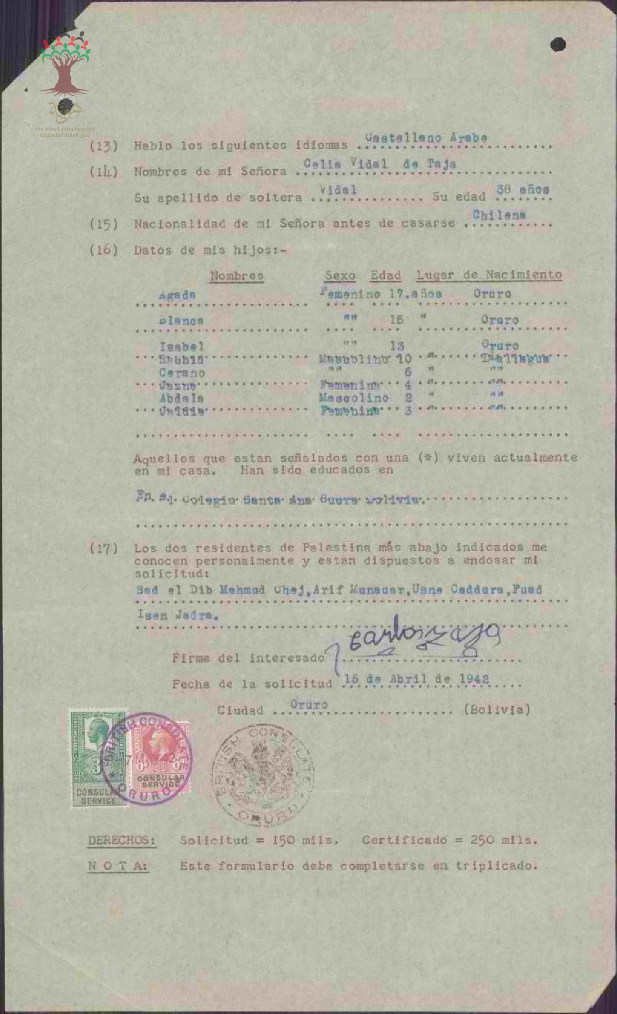 طلب الجنسية الفلسطينية-عبد الرحمن دبور-صفد/تشيلي
