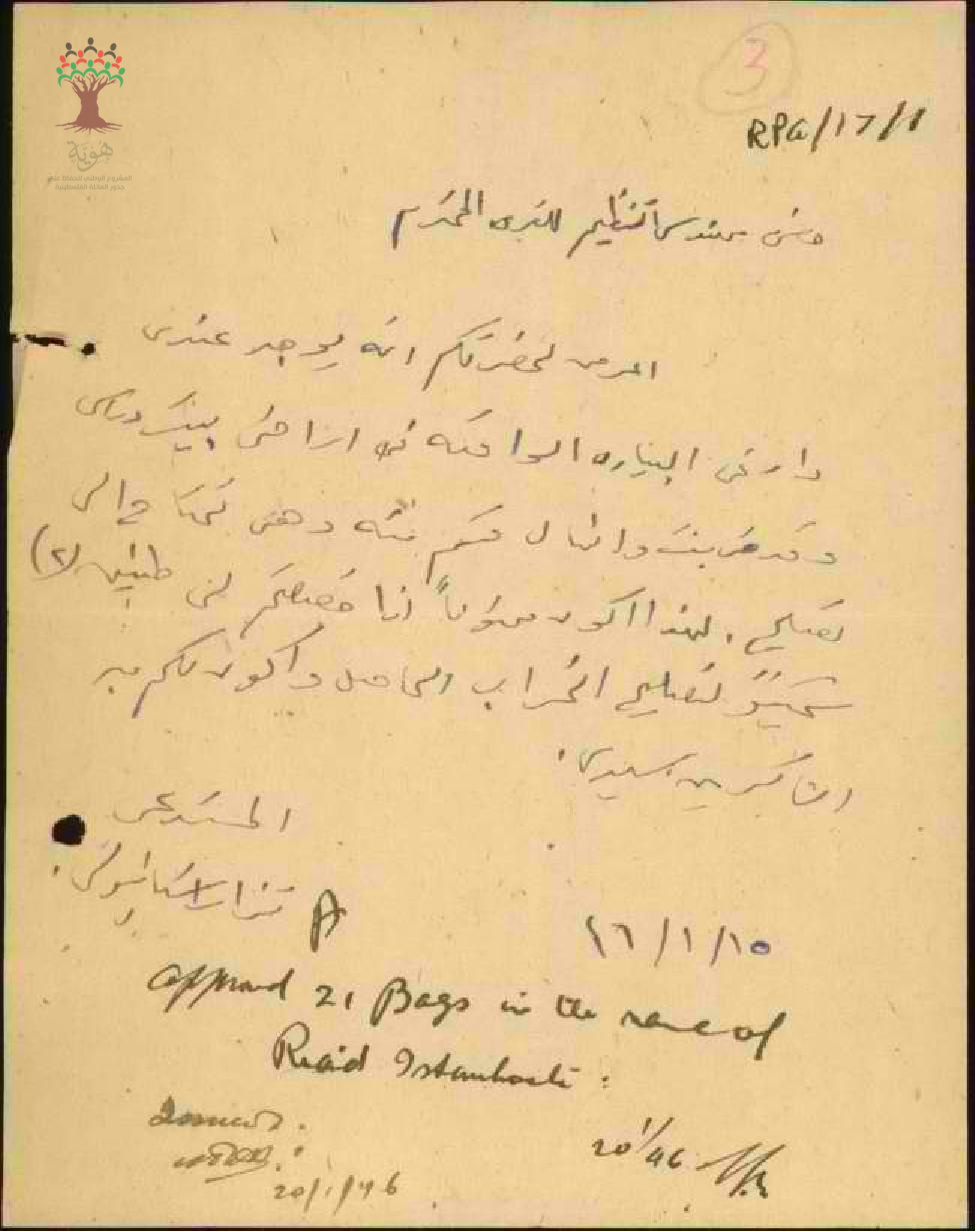 رسالة من نزار استانبولي يطلب الإذن بترميم داره في بيت دراس