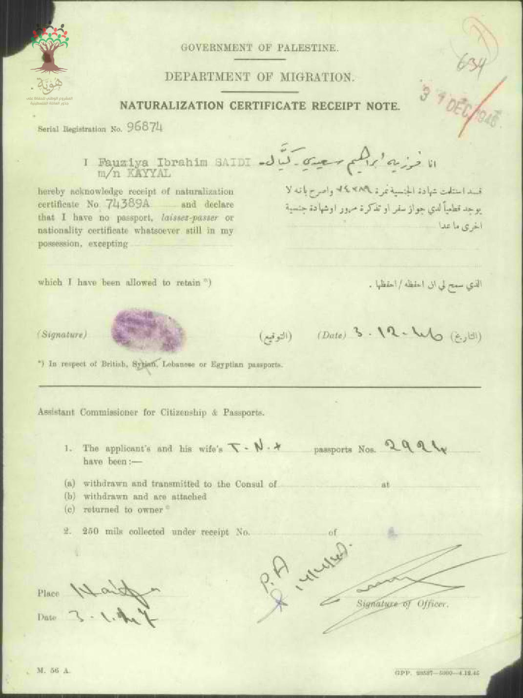 إيصال موقع من فوزية سعيدي كيال باستلام شهادة الجنسية الفلسطينية
