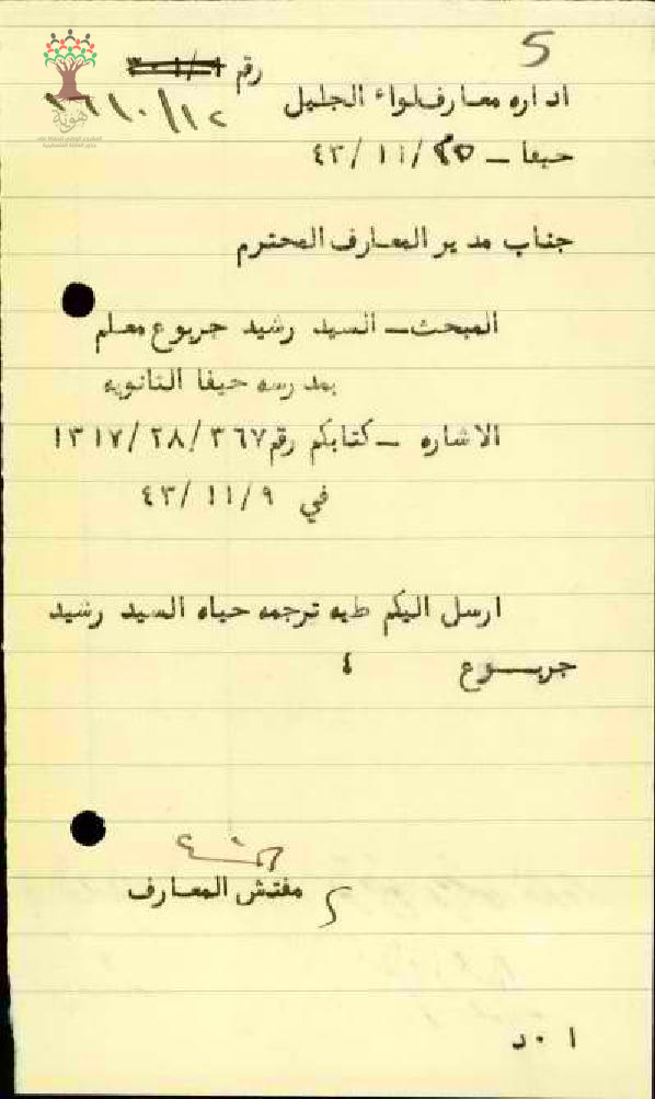 رسالة من مفتش المعارف إلى مدير المعارف يرسل فيها ترجمة حياة المعلم رشيد جربوع