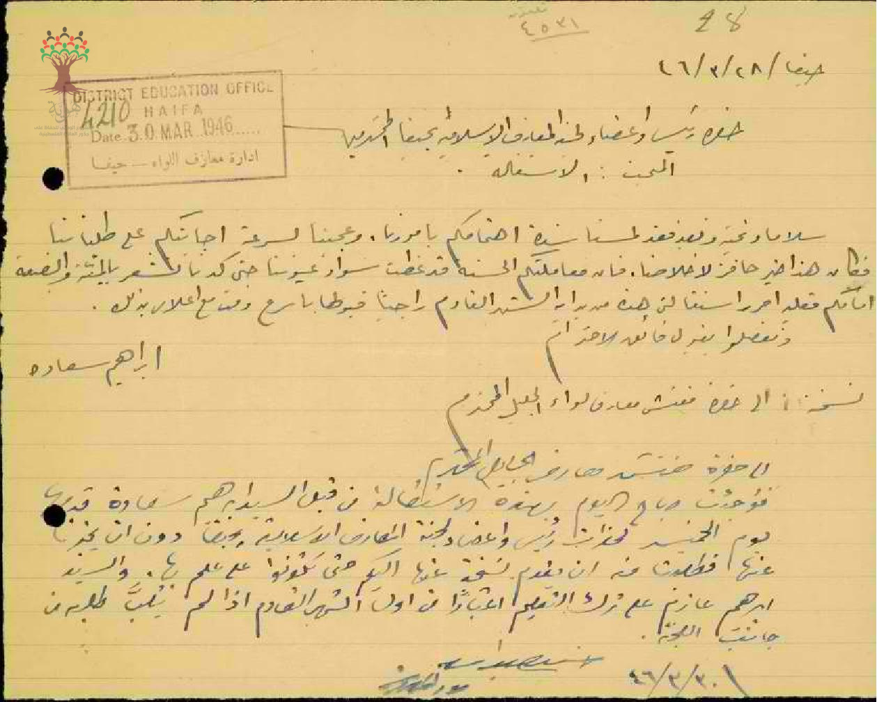 رسالة استقالة المعلم ابراهيم سعادة إلى رئيس وأعضاء لجنة المعارف الاسلامية بحيفا