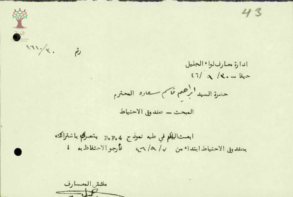 رسالة من مفتش المعارف إلى المعلم ابراهيم سعادة يعلمه باشتراكه بصندوق الاحتياط