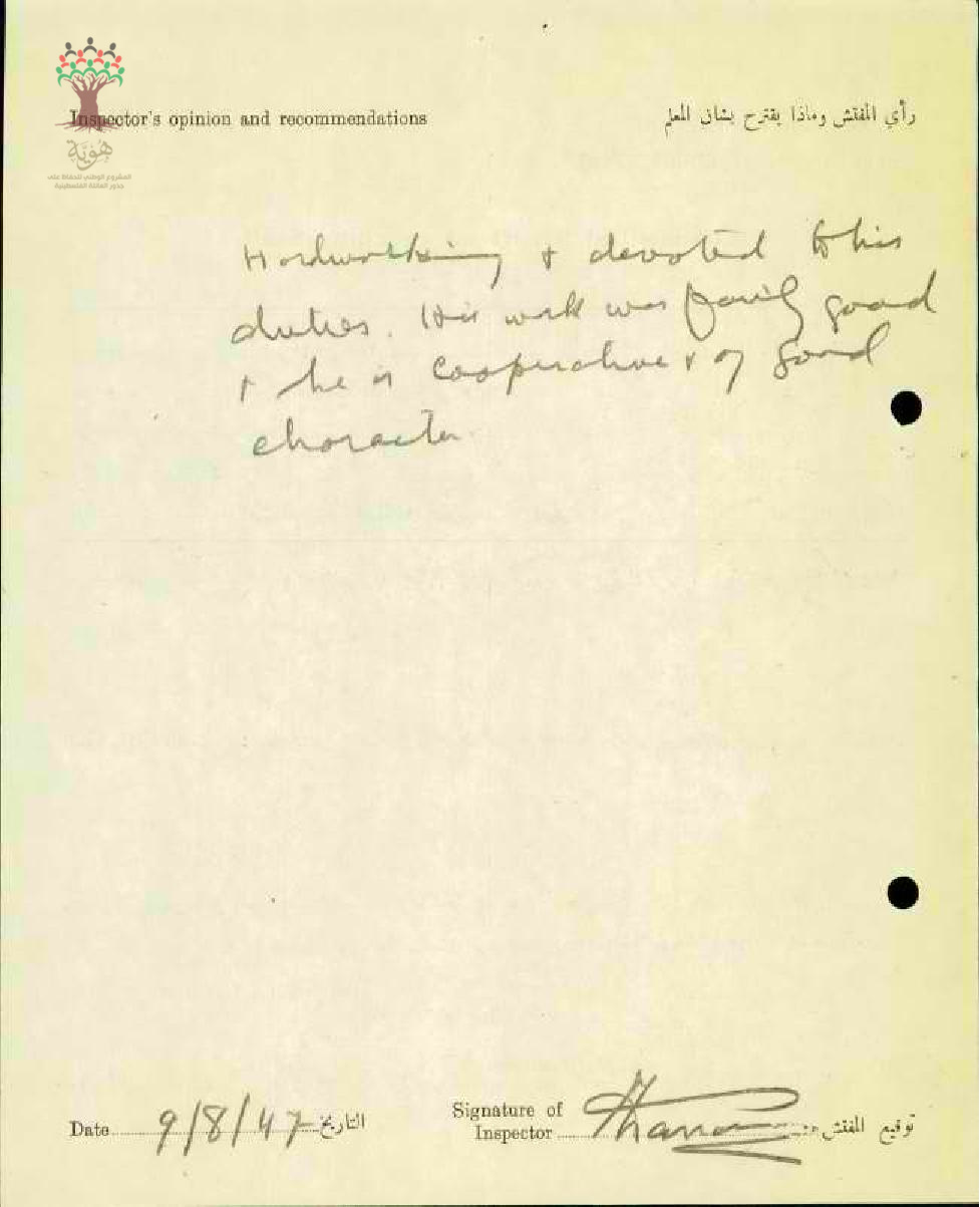 تقرير تفصيلي عن أداء المعلم ابراهيم سعادة في مدرسة الوحدة سنة 1947