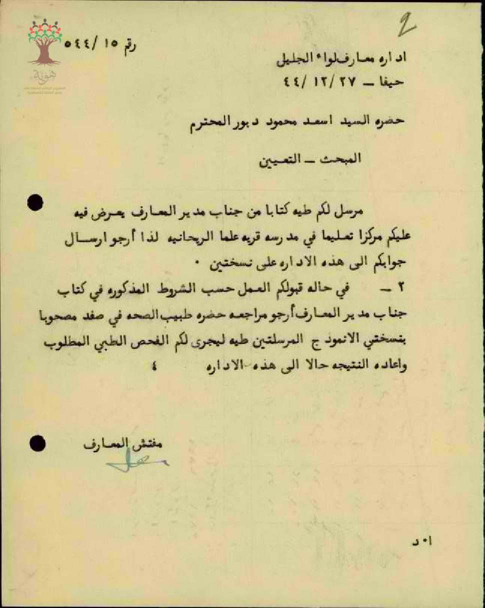 رسالة من مفتش المعارف الى المعلم أسعد دبور بخصوص التعيين في مدرسة علما الريحانية
