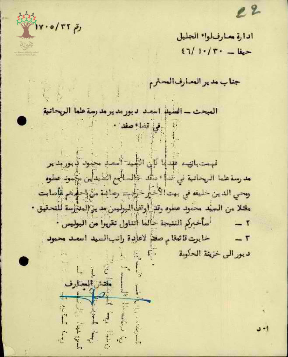 رسالة من مفتش المعارف الى مدير المعارف بخصوص توقيف المعلم أسعد دبور لدى البوليس